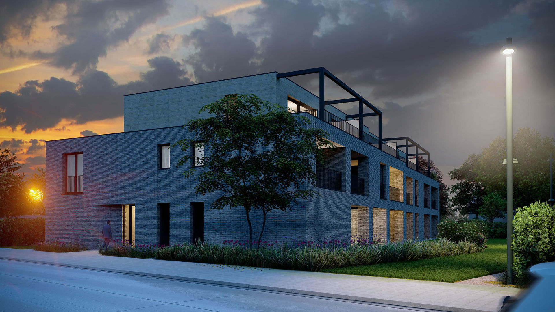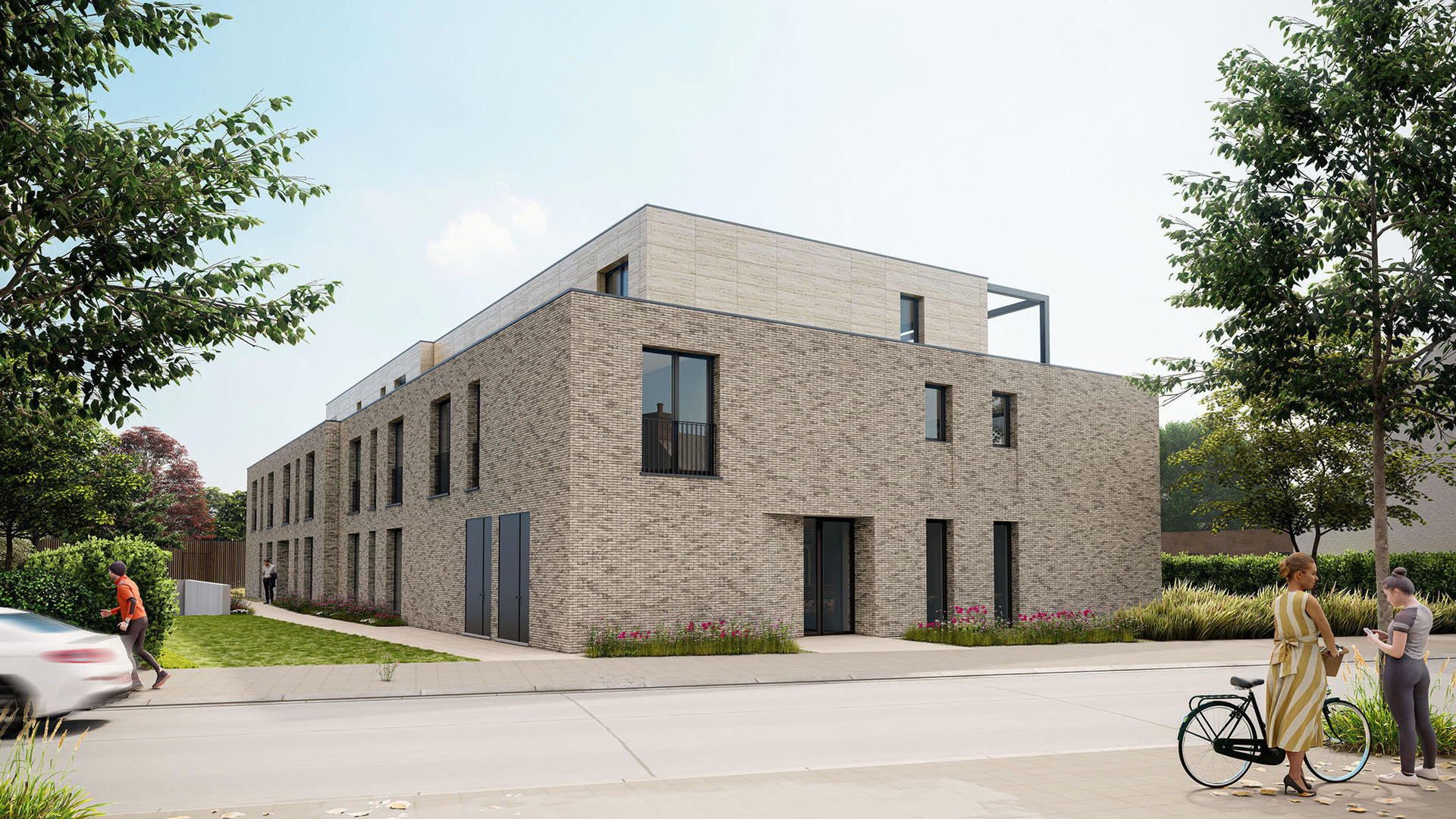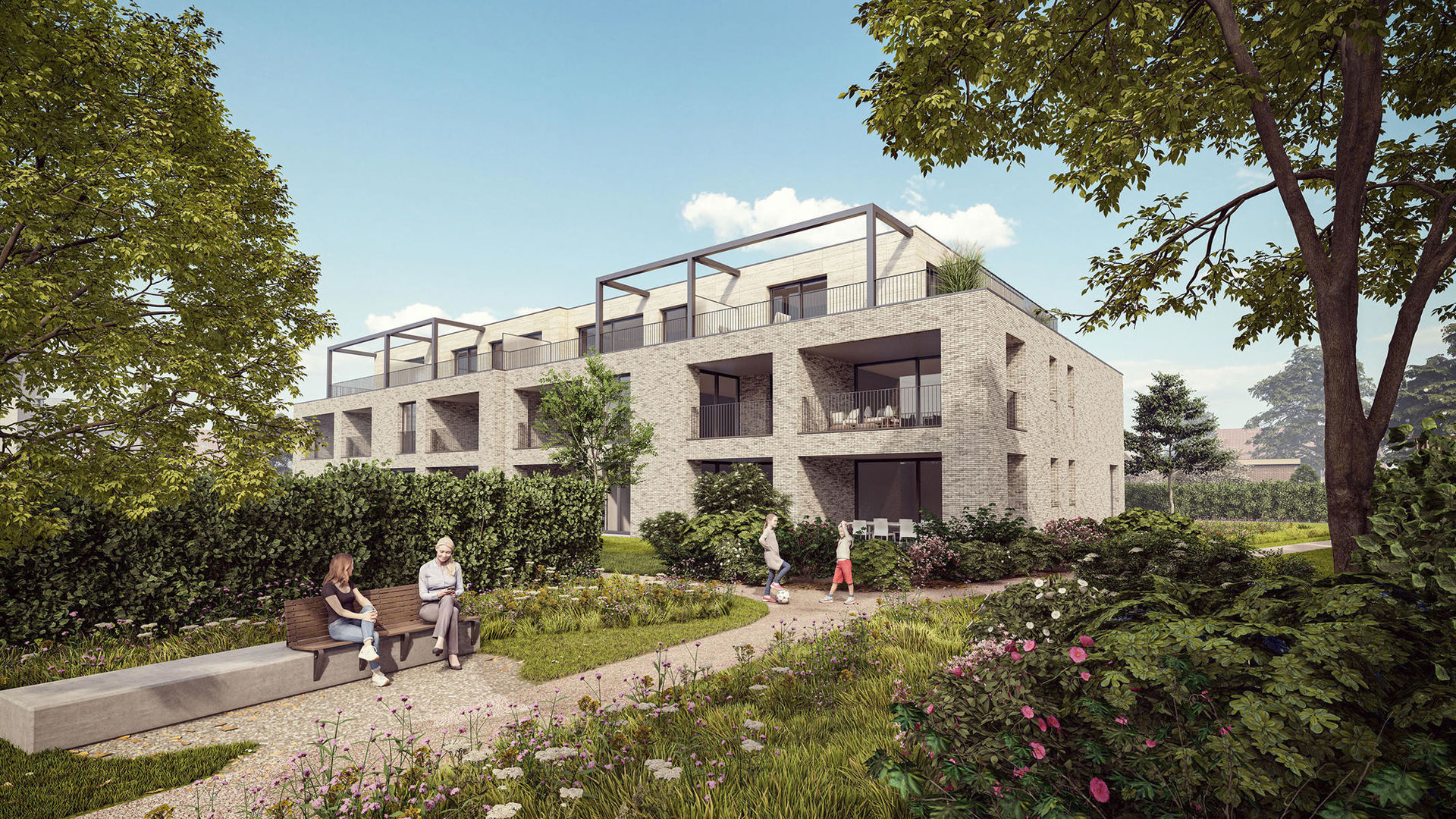 Het project wordt haaks op de straat ingepland, volledig los van de aanpalende woningen. Links naast het appartmentsgebouw bevindt zich de inrit naar de ondergrondse parking en fietspad naar de fietsenstalling. Rechts naast het gebouw is de ruime gemeenschappelijke tuin gelegen.