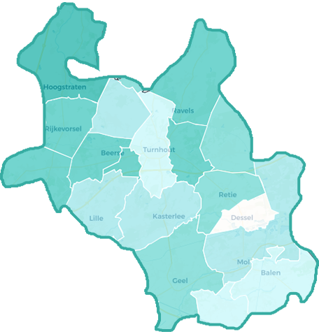 Op de afbeelding hierboven vind je een kaart van de gemiddelde vastgoedprijzen per gemeente. Met een gemiddelde verkoopprijs van €470.110 is Hoogstraten de duurste gemeente uit onze regio, gevolgd door Ravels en Rijkevorsel. Ook Beerse (€420.818), Vosselaar (€439.792) en Oud-Turnhout (€423.015) zijn traditioneel de duurdere gemeentes. In Lille en Kasterlee variëren de vastgoedprijzen tussen €359.518 en €370.900. Arendonk is dan weer iets goedkoper dan Retie met een gemiddelde prijs van €380.235 t.o.v. €412.826. Hoe zuidelijker we kijken in onze regio, hoe lager de prijzen worden met een gemiddelde verkoopprijs van €336.863 in de gemeente Mol. In Balen en Meerhout zakken deze prijzen zelfs nog lager met respectievelijk €327.402 en €288.929.