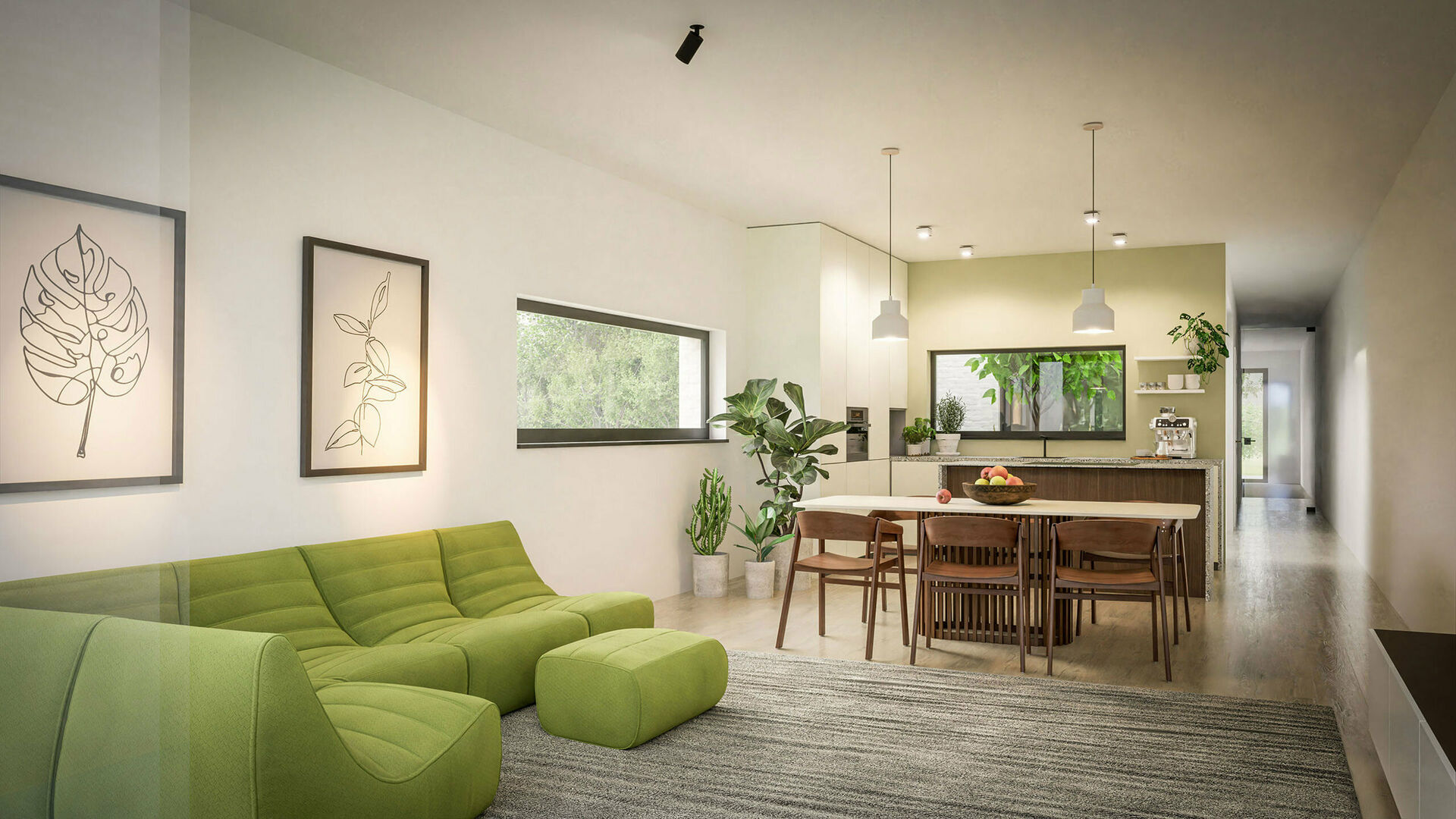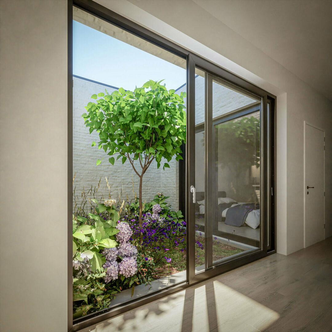 - De individuele binnentuintjes (patio’s) van de rijwoningen