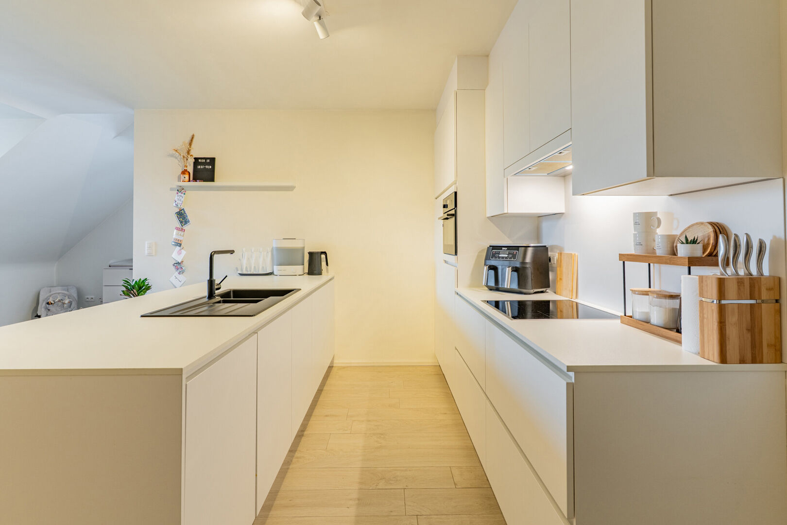 De grote keuken is open maar toch subtiel afgescheiden van de living. Er zijn vele kasten en ingebouwde toestellen.