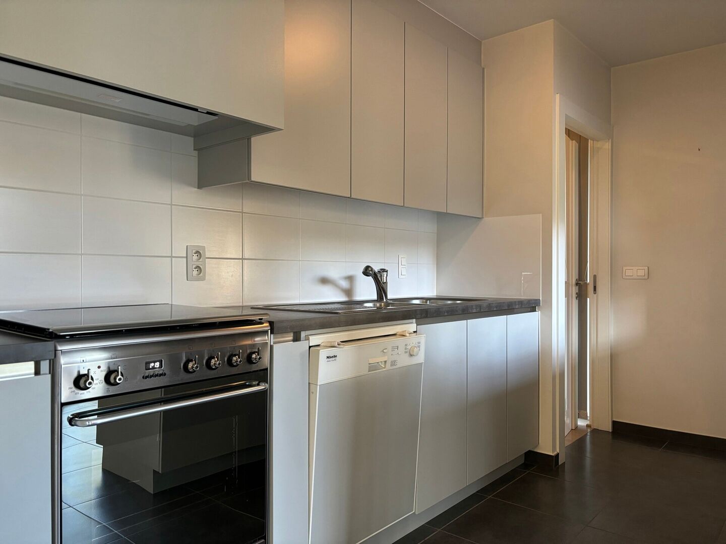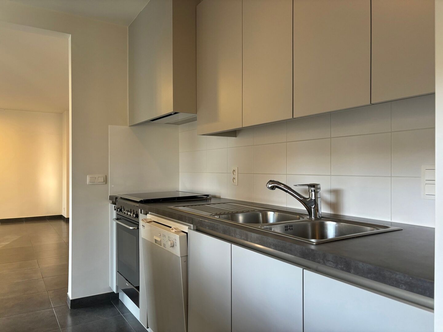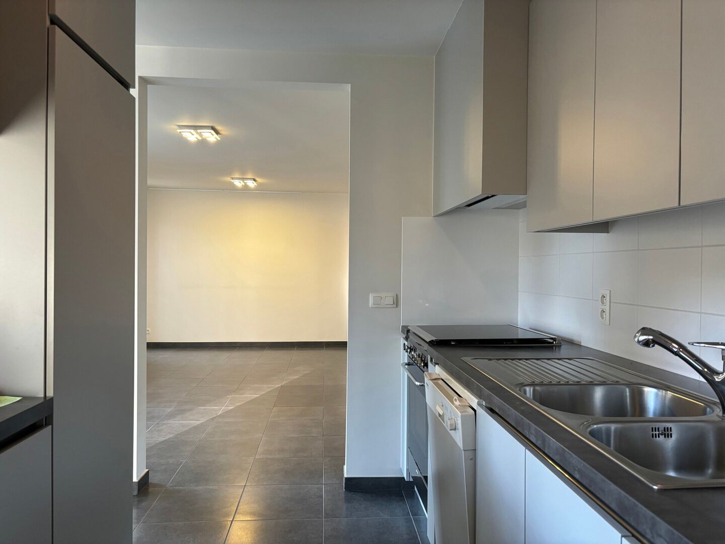 We betreden het appartement via de inkomhal, nadien komen we meteen terecht in de lichtrijke woonkamer met open keuken die volledig geïnstalleerd is (oven, microgolf, kookplaat, vaatwasser en koelkast).