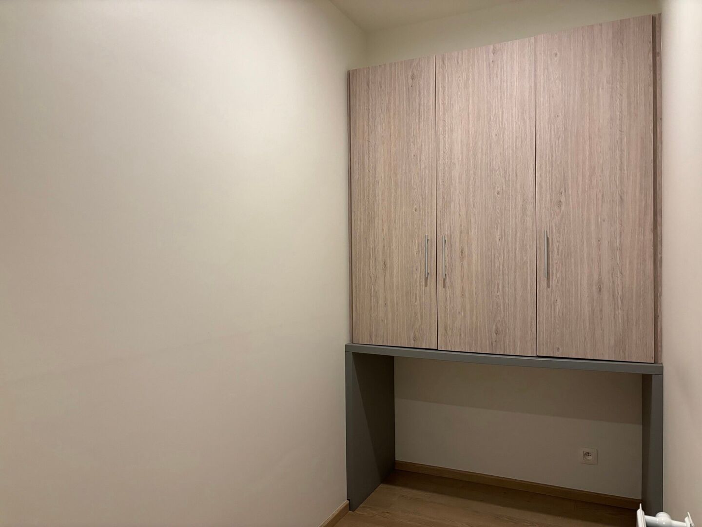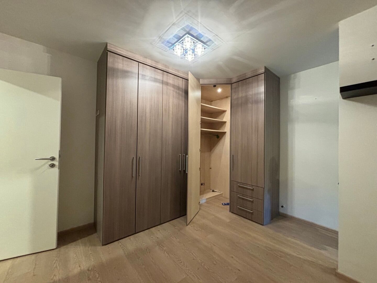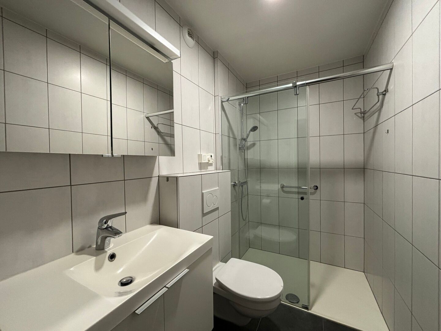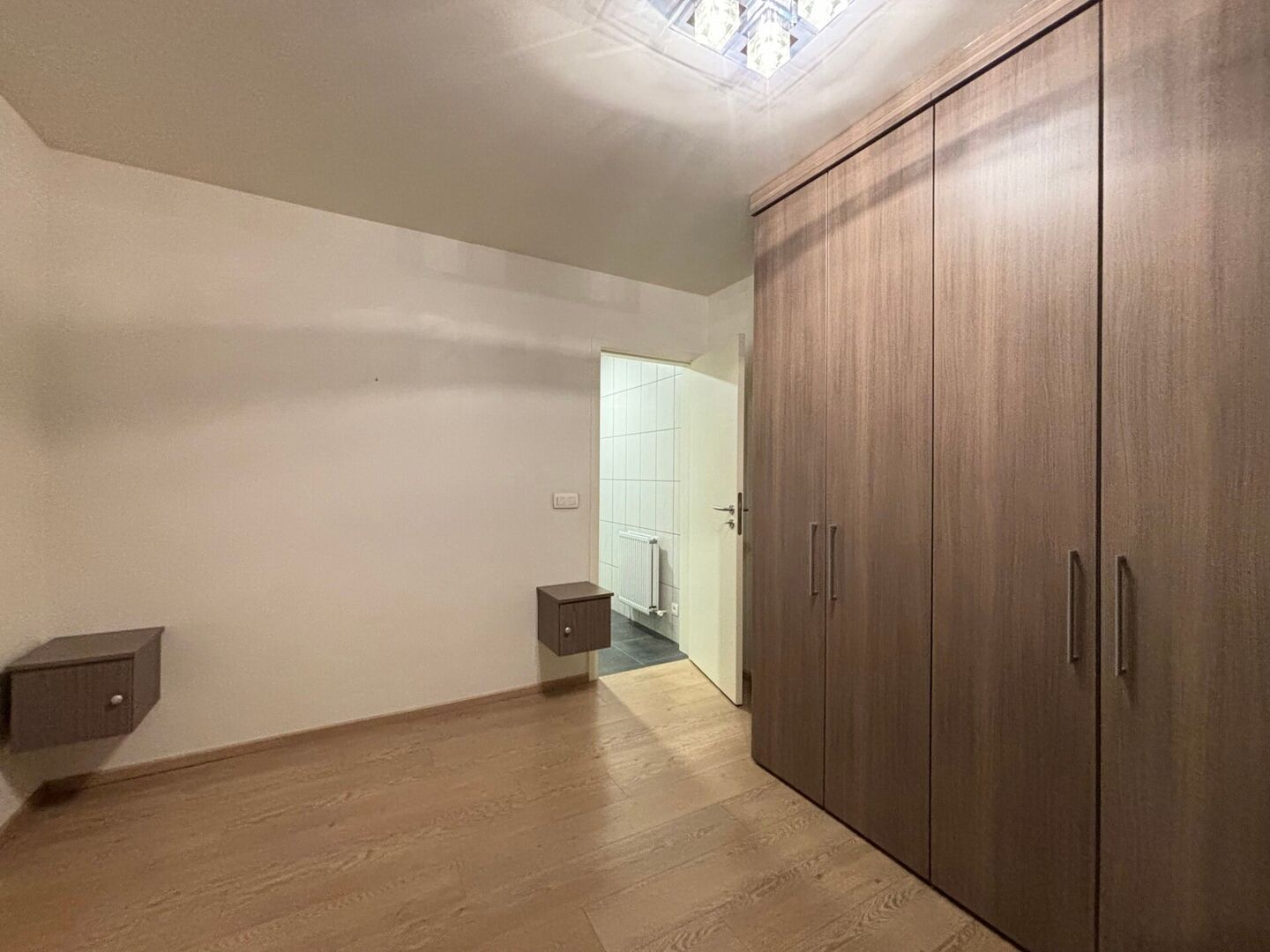 Verder is er 1 slaapkamer (met ingebouwde kasten) die meteen toegang geeft tot de badkamer (douche, wastafel, apart toilet)