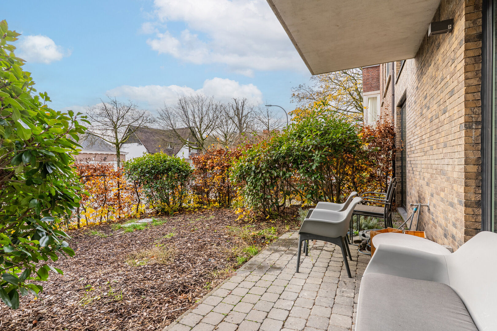 Via de grote raam in de leefruimte heeft men toegang tot het tuintje met terras.