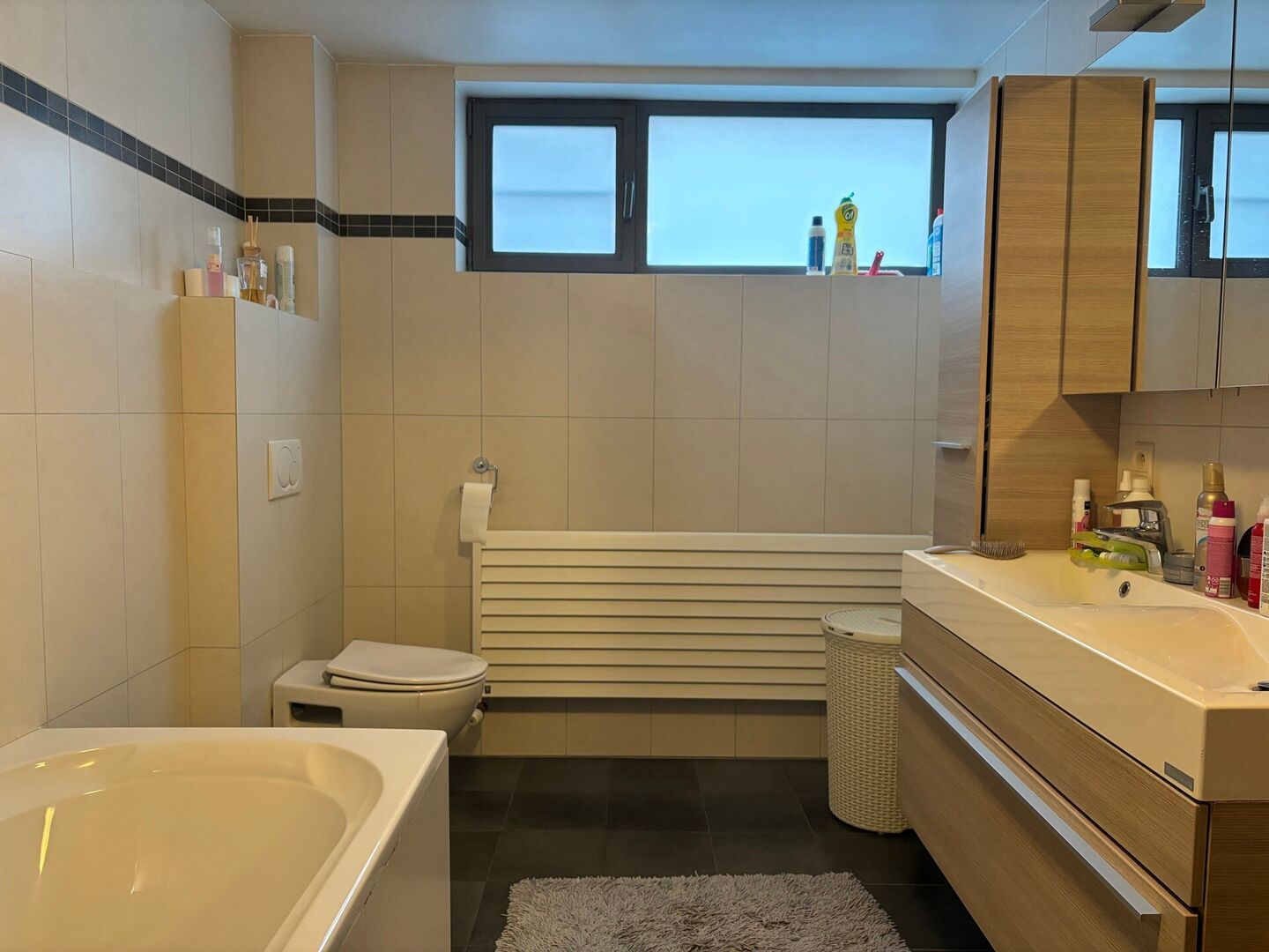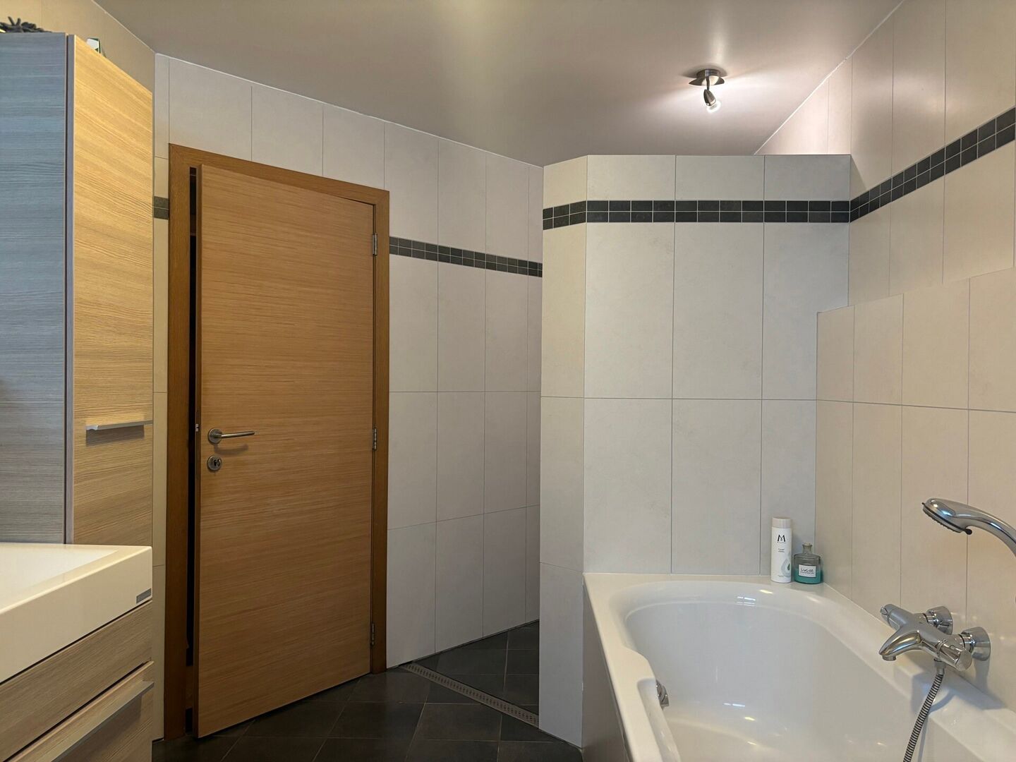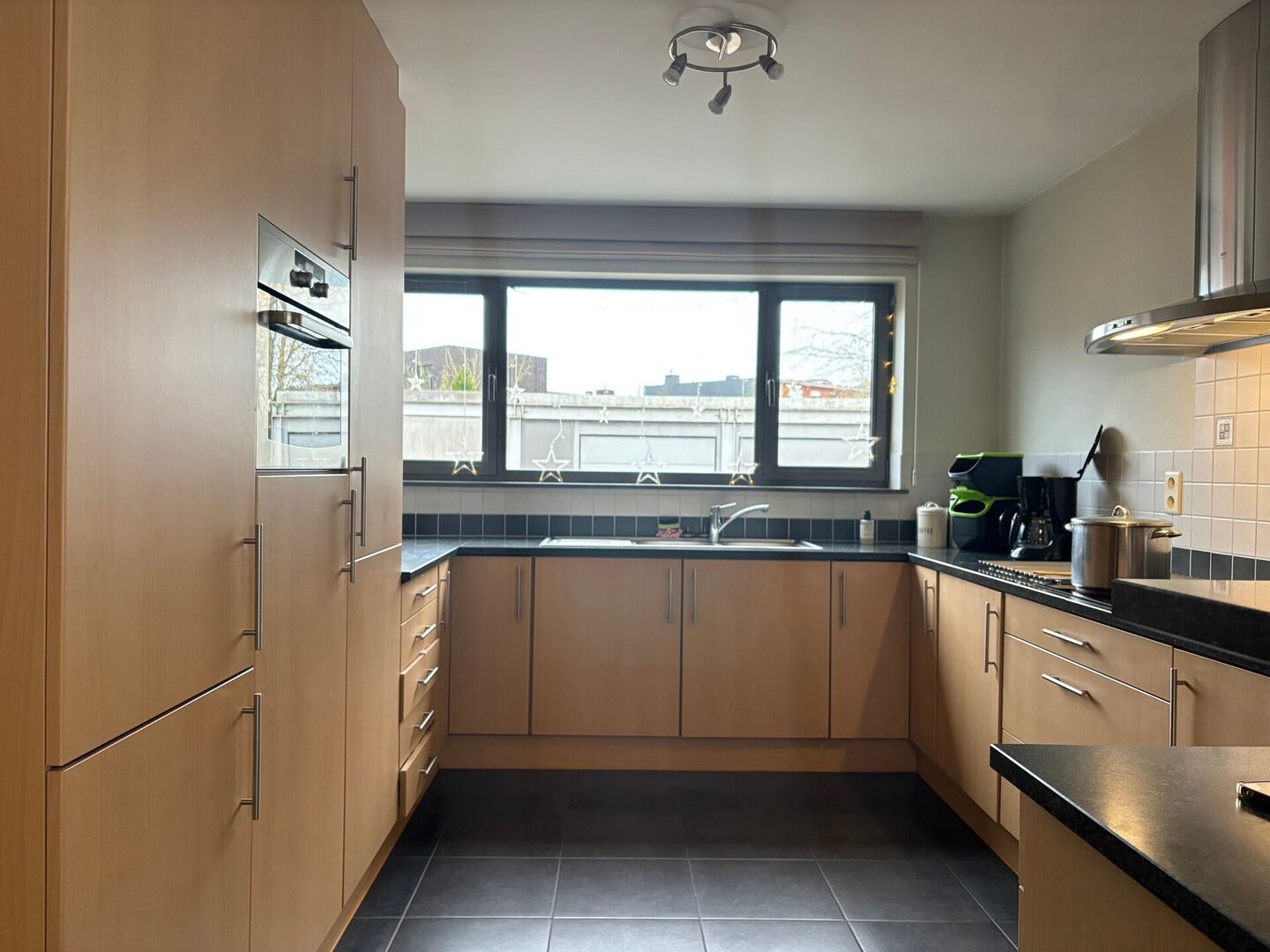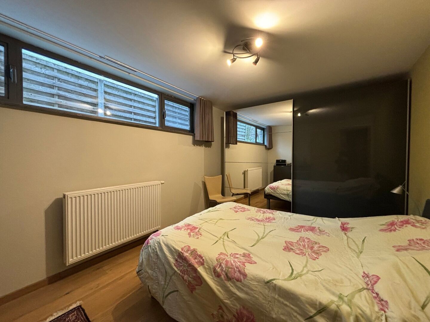 We betreden het appartement via een afzonderlijke ingang en is voorzien van een inkomhal met gastentoilet, een zeer lichte woonkamer, een ruime open keuken met eetplaats en een bureauruimte.