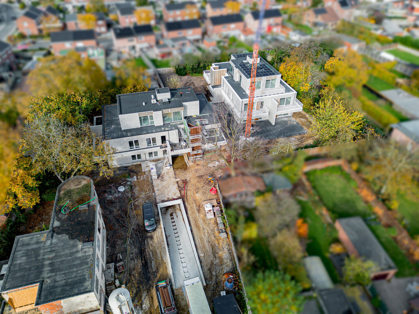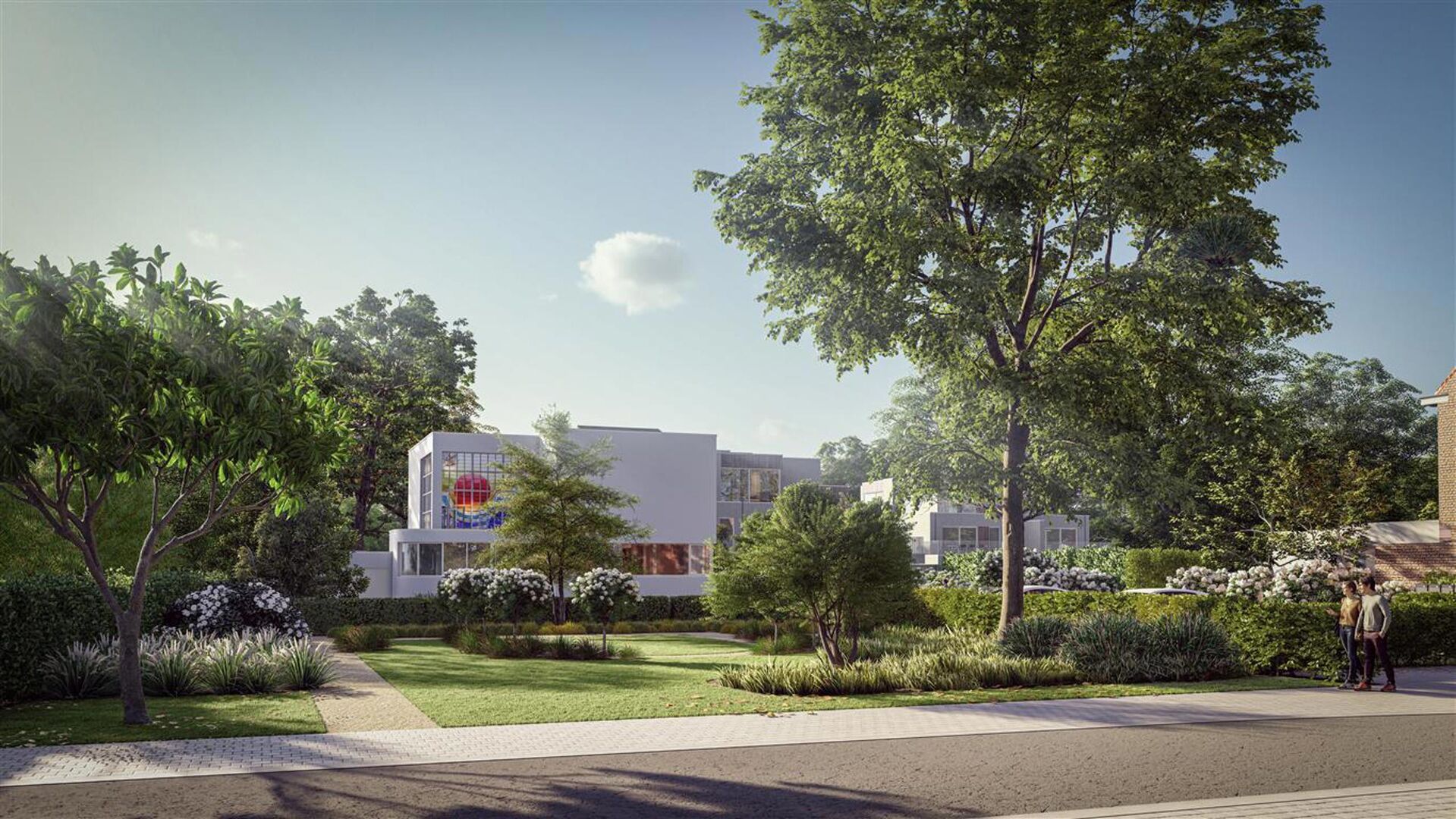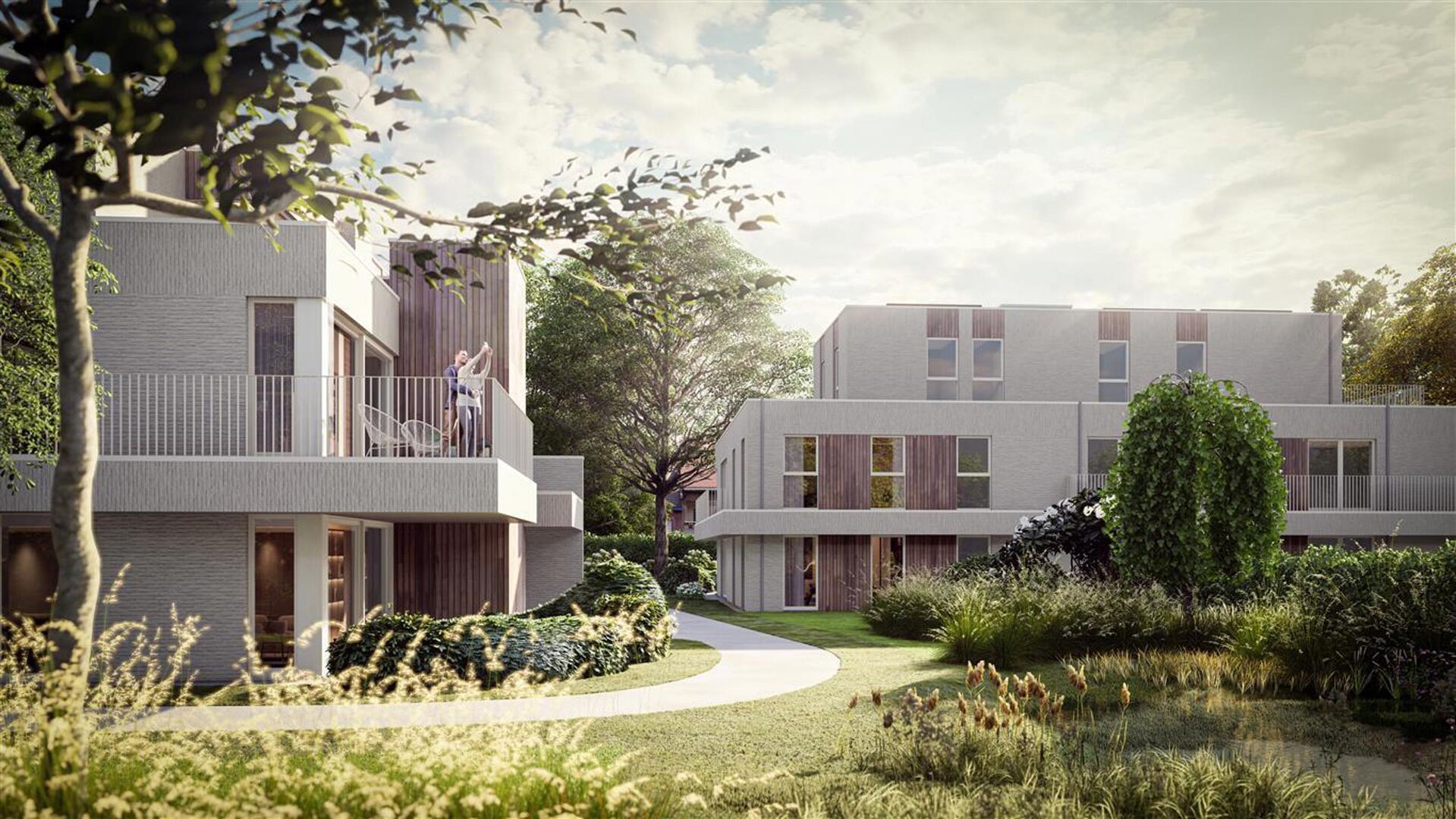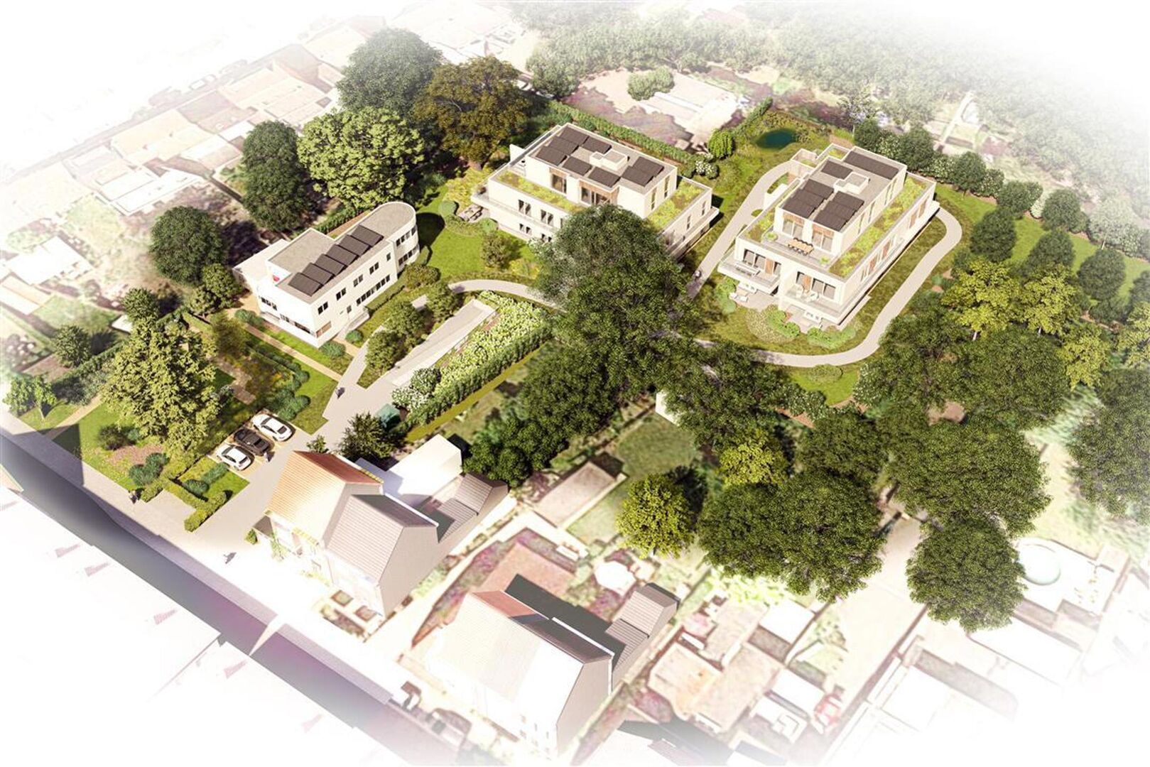 Zowel de villa als de urban villa’s nestelen zich in het bestaande bomenpatrimonium waarbij de tuin verder wordt aangelegd onder leiding van een tuinarchitect’.