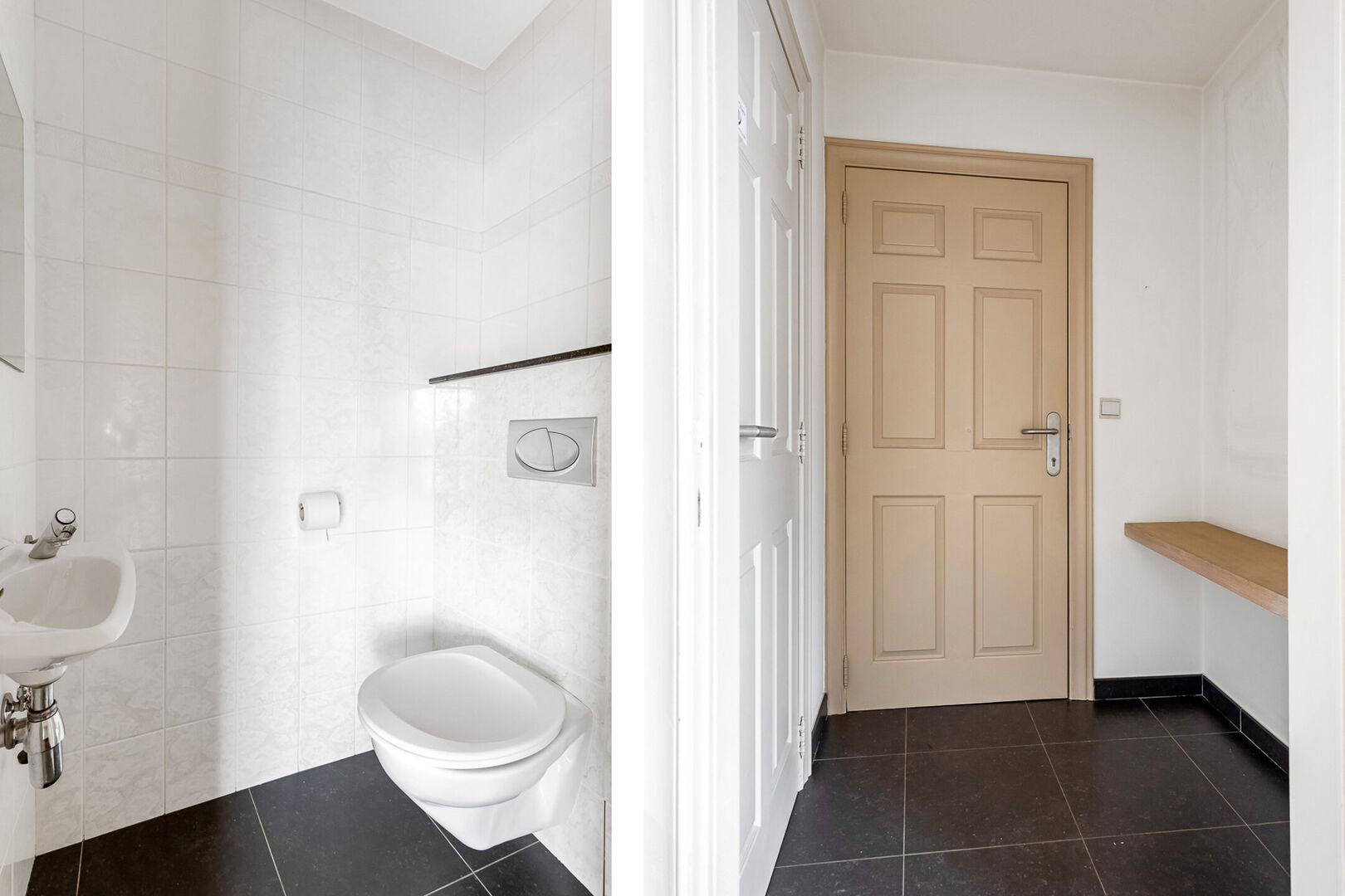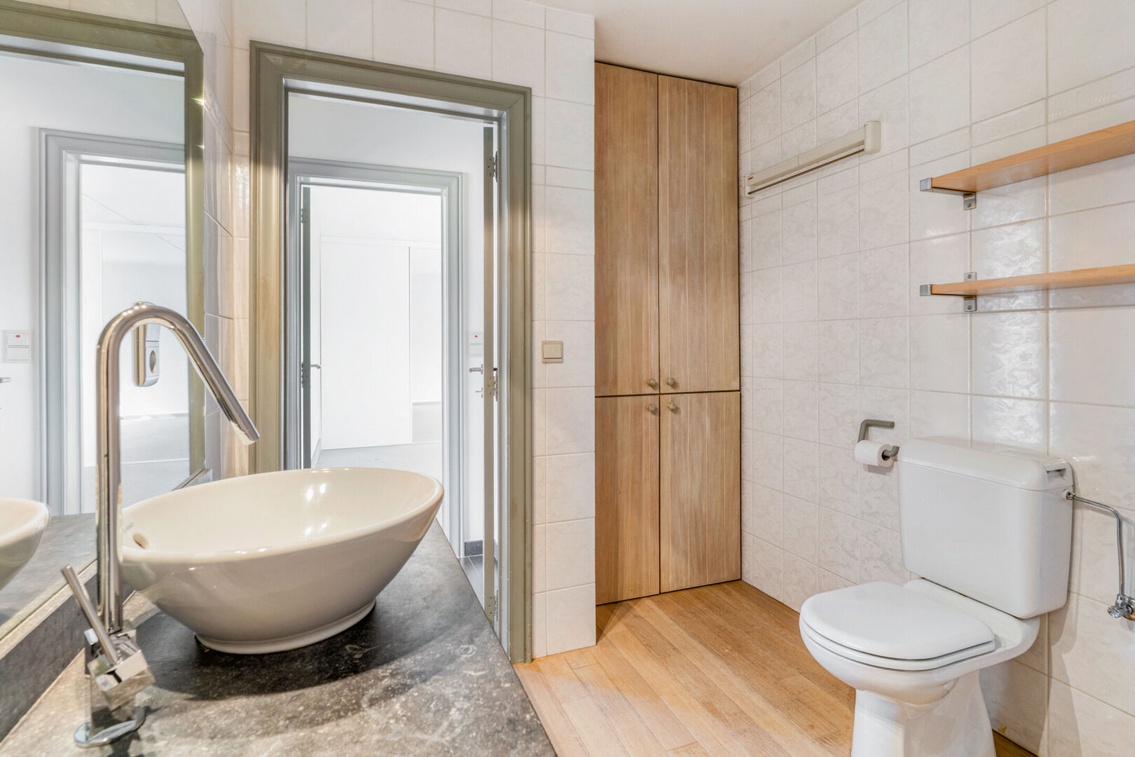 In een appartementsgebouw, gelegen aan de Steenweg op Mol nr 6, op wandelafstand van de Grote Markt van Turnhout, betreden we via de glazen voordeur, de gang en nemen we de lift naar de bovenste verdieping. De entree van het appartement heeft een gastentoilet en vestiairehoek, met daarnaast een kleine technische berging. We lopen meteen door naar de ruime woonkamer op parket. Goede lichtinval is verzekerd door een raam voorin, en de grote schuifraam achteraan die uitgeeft het zeer ruime terras wat zicht biedt op een groot deel van de stad. Bij het terras hoort een gesloten berging waarin een infrarood saunacabine staat.