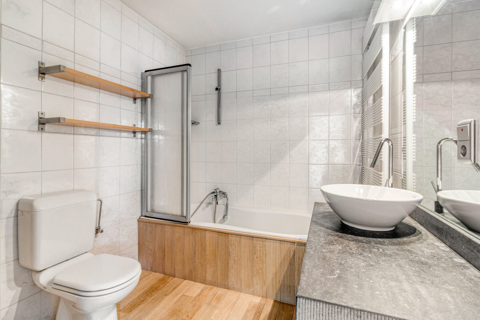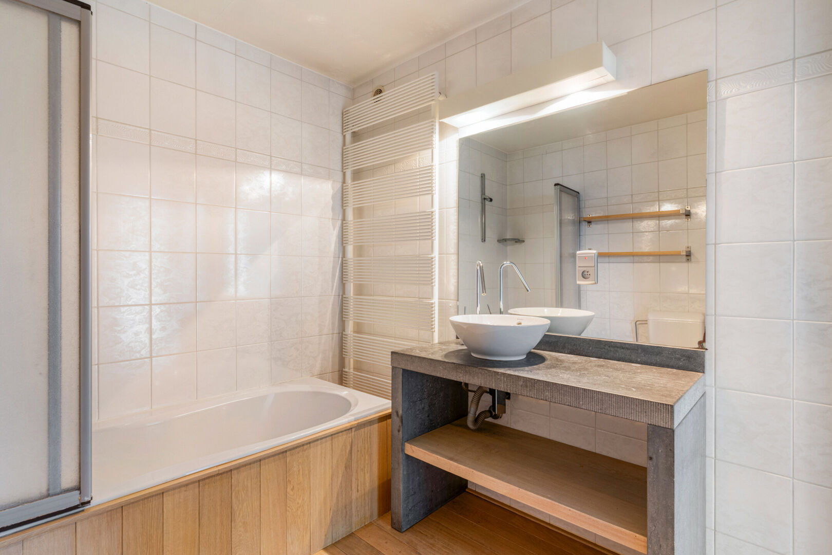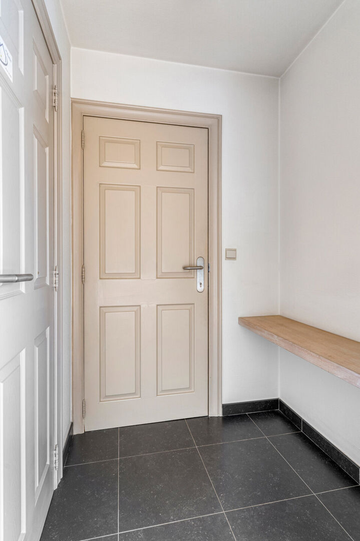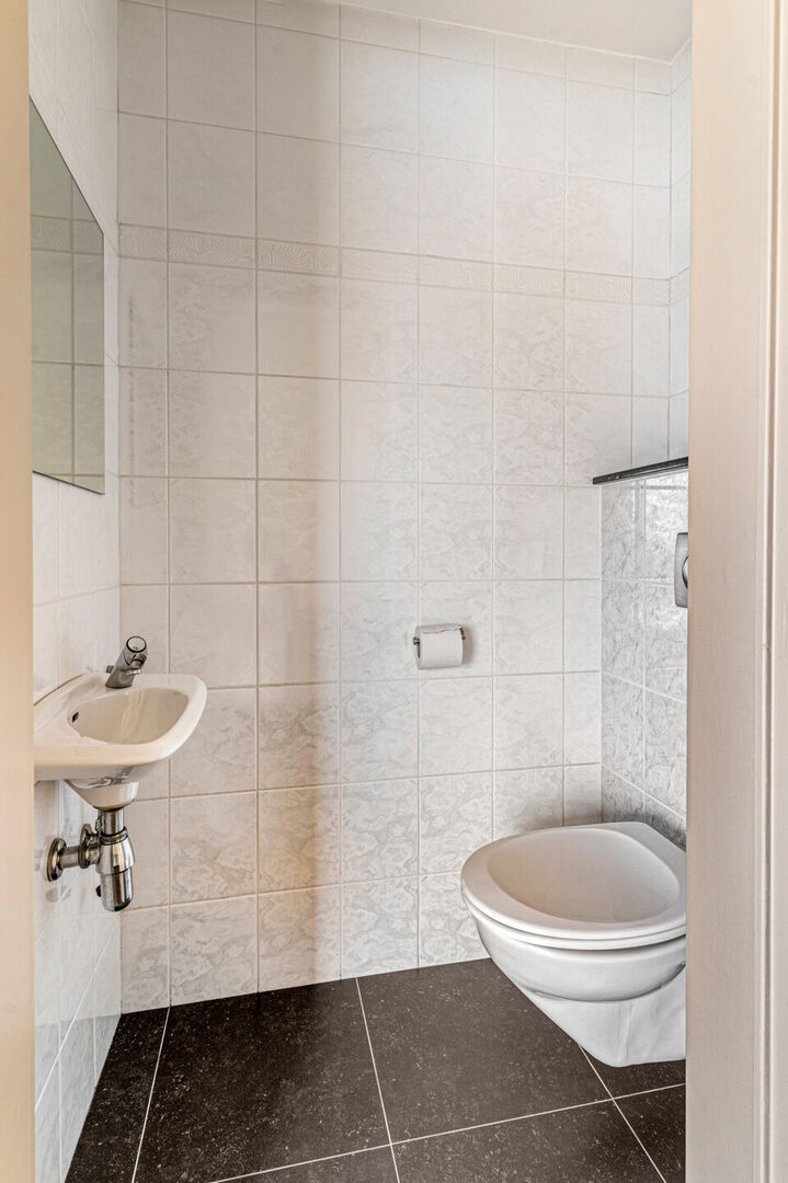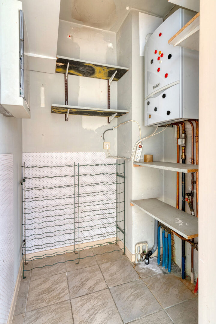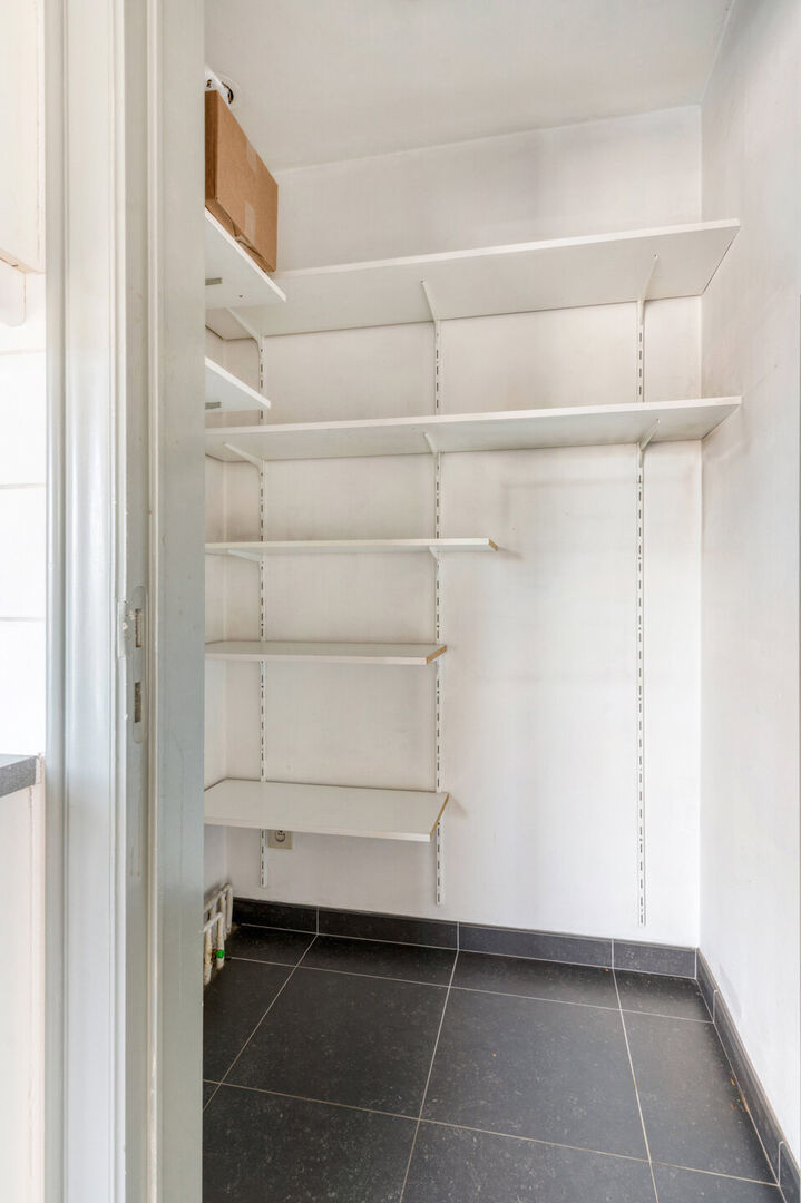De leefruimte is verbonden met een ruime open keuken voorzien van koelkast, kookfornuis met dampkap, vaatwasser en een oven. Je geniet tijdens je ontbijt aan de grote boograam van de passage aan de straatkant. De keuken is voorzien van een geriefelijke voorraadberging. Vervolgens treffen we twee ruime slaapkamers aan waarvan de master uitgeeft op het terras. De badkamer is uitgerust met een ligbad en glazen douchescherm, de wastafel en het toilet en ruimte voor wasmachine en droger.