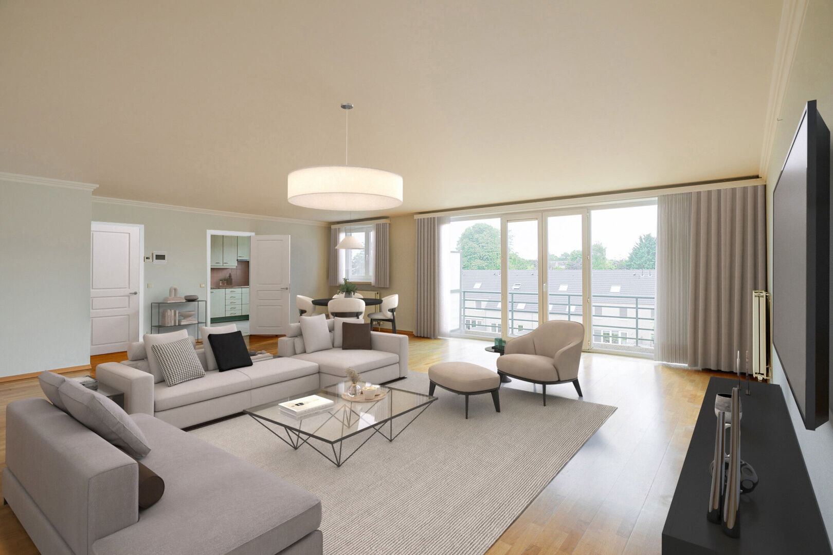 In deze woonkamer heb je een prachtig uitzicht door de grote ramen plus toegang tot het tweede terras met zicht op de binnentuin en een deel van Mol.