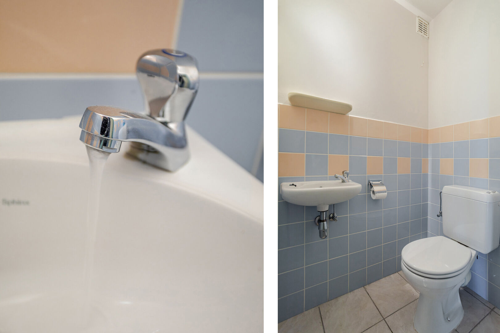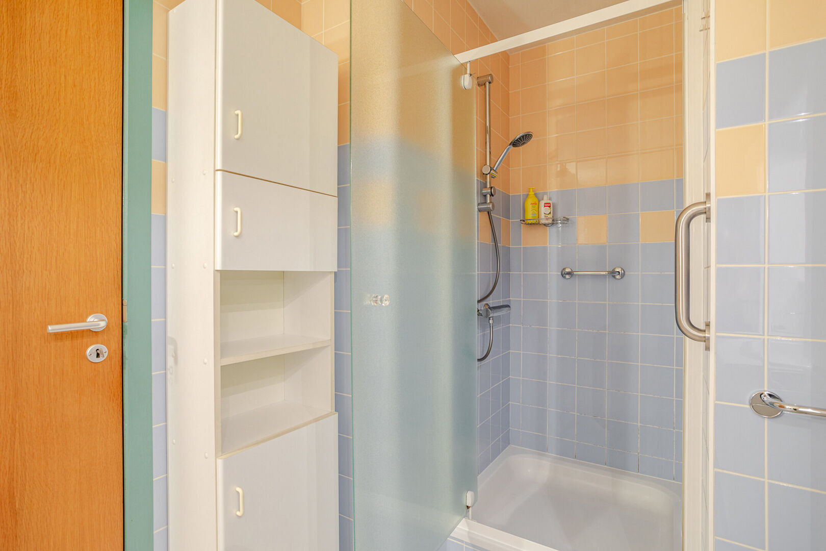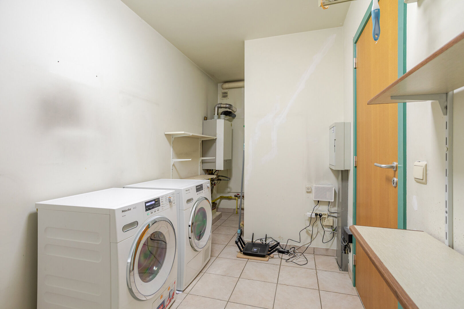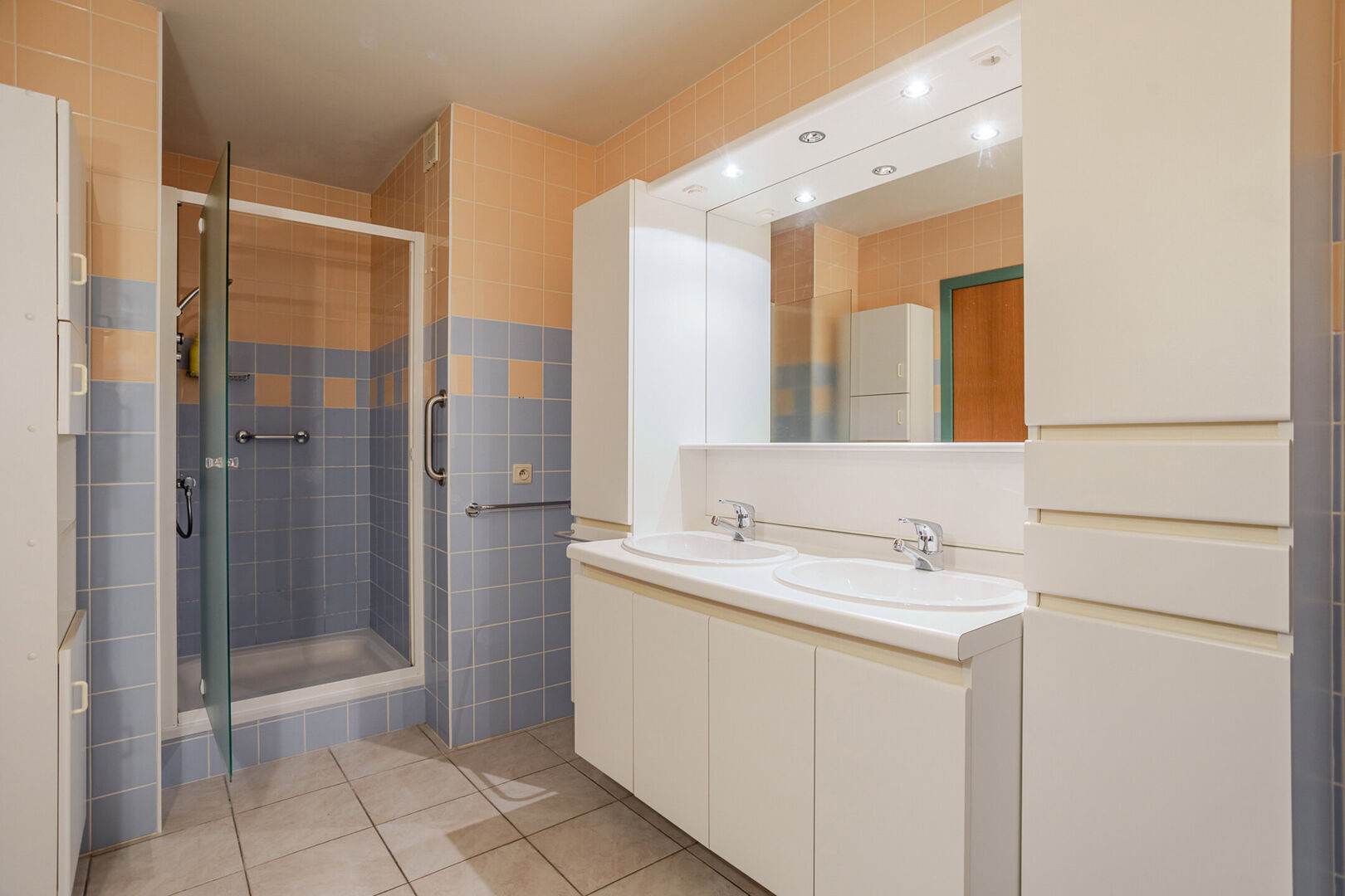 Aan de andere zijde van de gang bevindt zich een badkamer met een dubbele lavabo en een douche, een apart toilet en een wasplaats/berging.