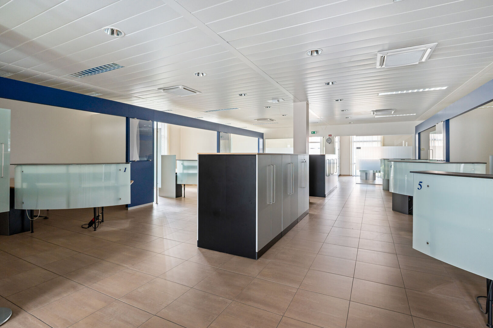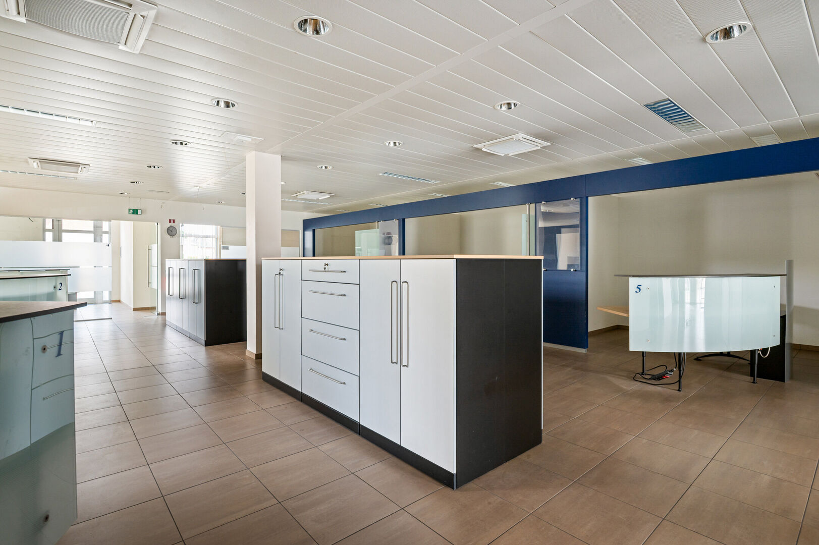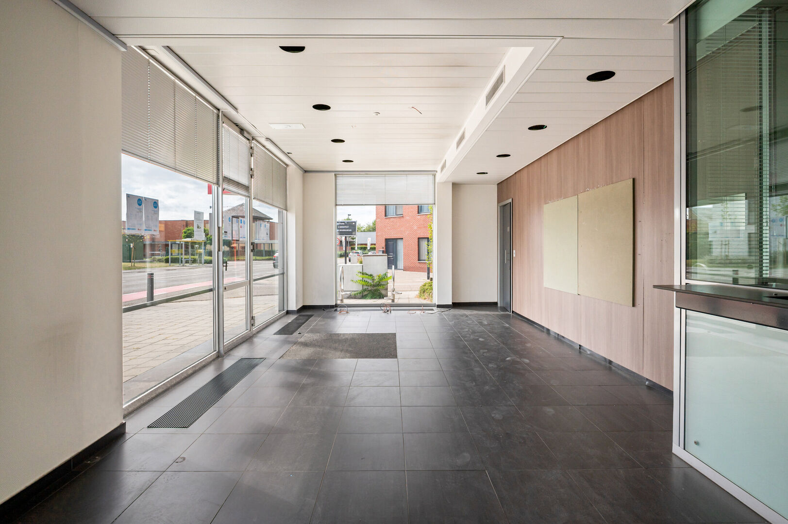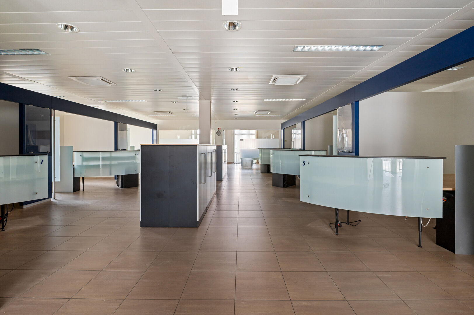 - Gelijkvloers: inkom, onthaal, tellerzaal, wachtlokaal, adviesruimte, twee kantoren, backoffice, dienstlokaal, beneden ruimte
