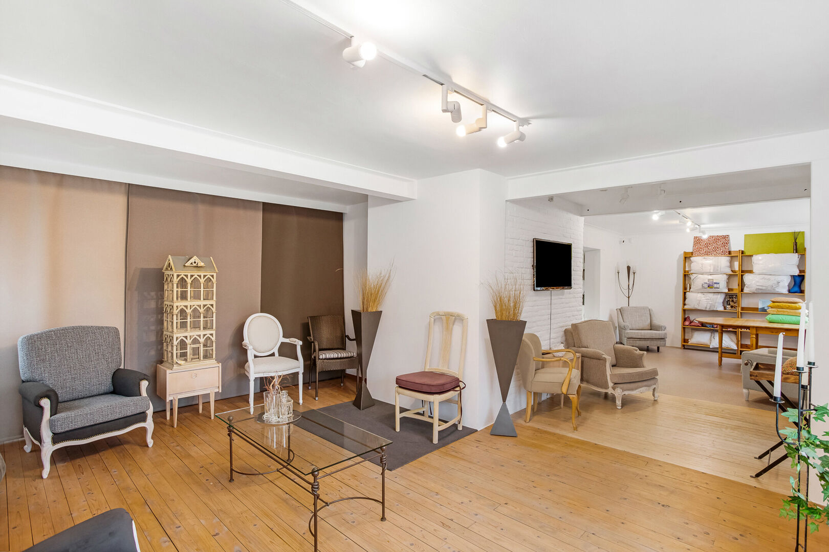 We komen de woning binnen in de ruimte die vandaag als toonzaal wordt gebruikt, deze kan ingevuld worden als leefruimte. Verder is er op het gelijkvloers nog een bureauruimte, een wasplaats en een apart toilet.