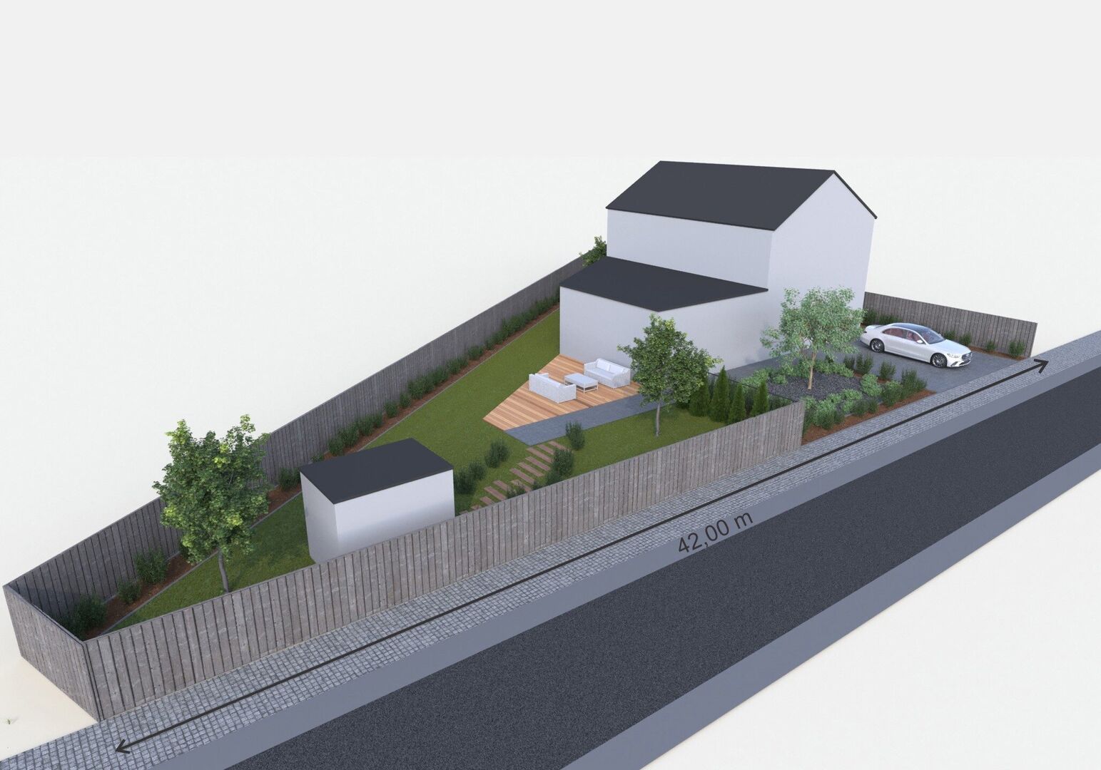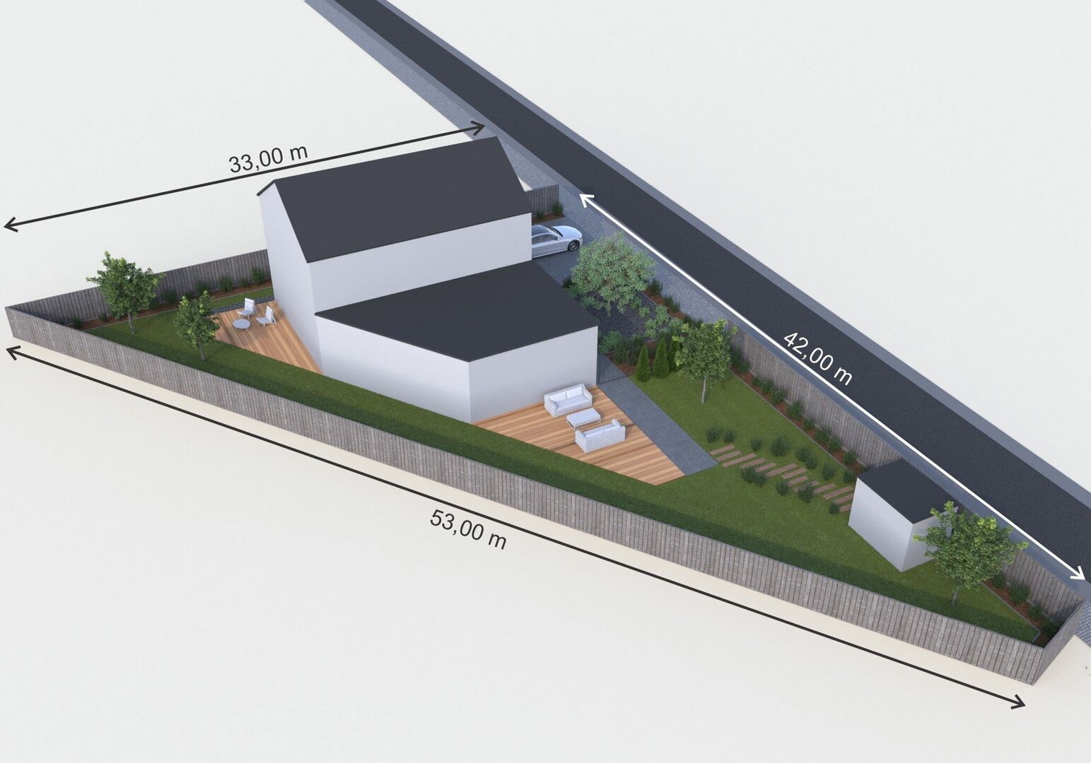 De perceelvorm van dit perceel kent een perceeldiepte van 33m. en 5m aan de andere kant.