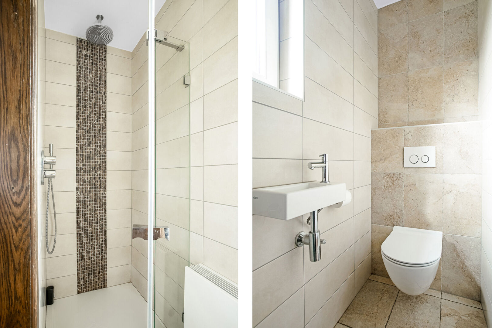 Via de achterdeur komen we in de hal met ingemaakte kasten en hebben we toegang tot een extra, vernieuwde badkamer met regendouche en een toilet. Aansluitend bevindt zich een handige wasruimte.