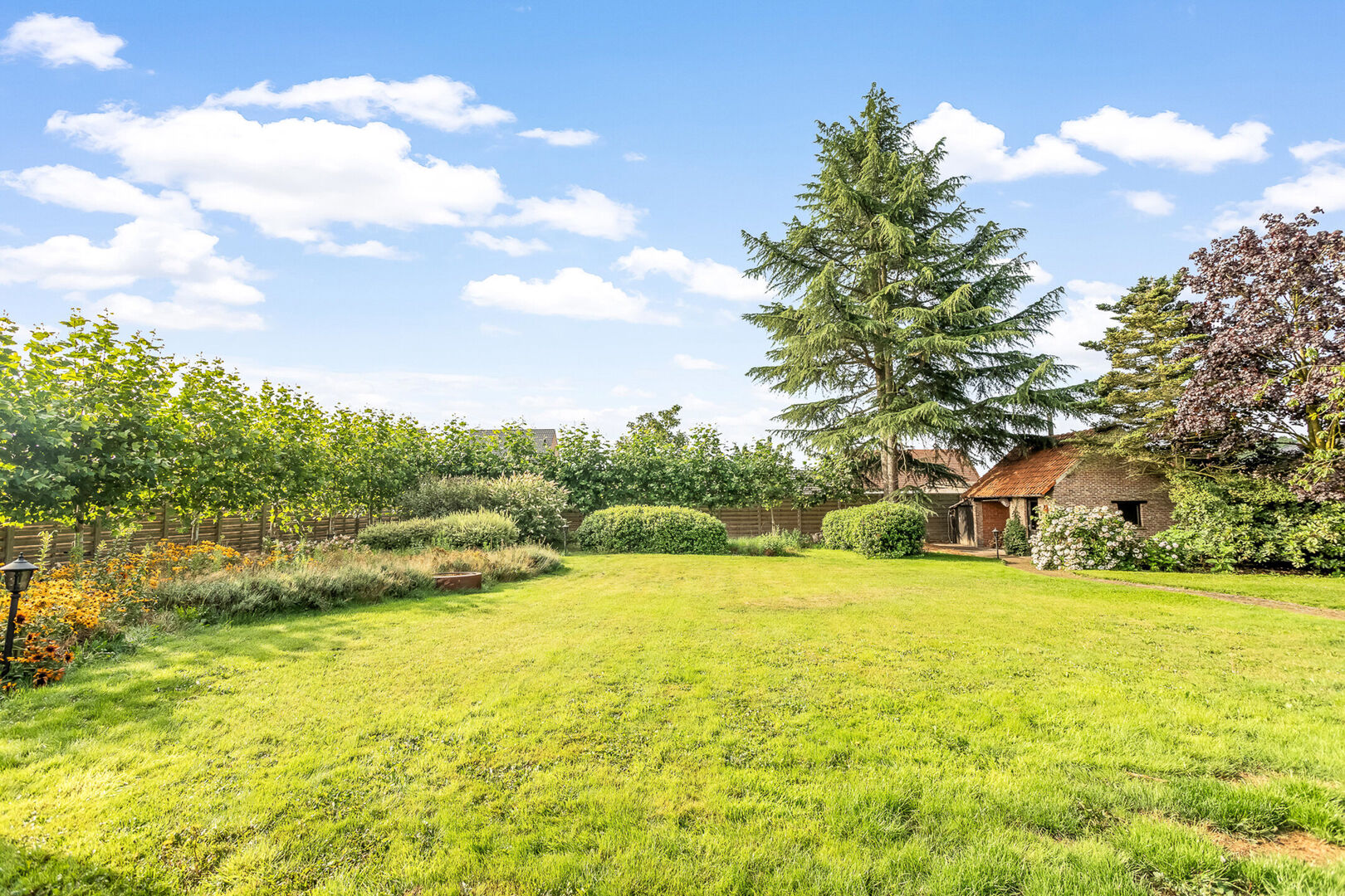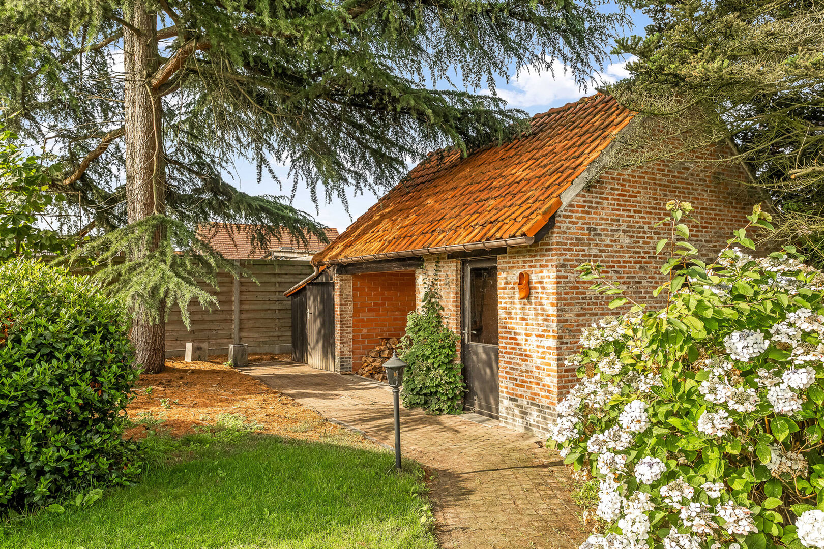 Rechtsachter in de tuin bevindt zich een groot tuinhuis dat dienst kan doen als knutselkamer.