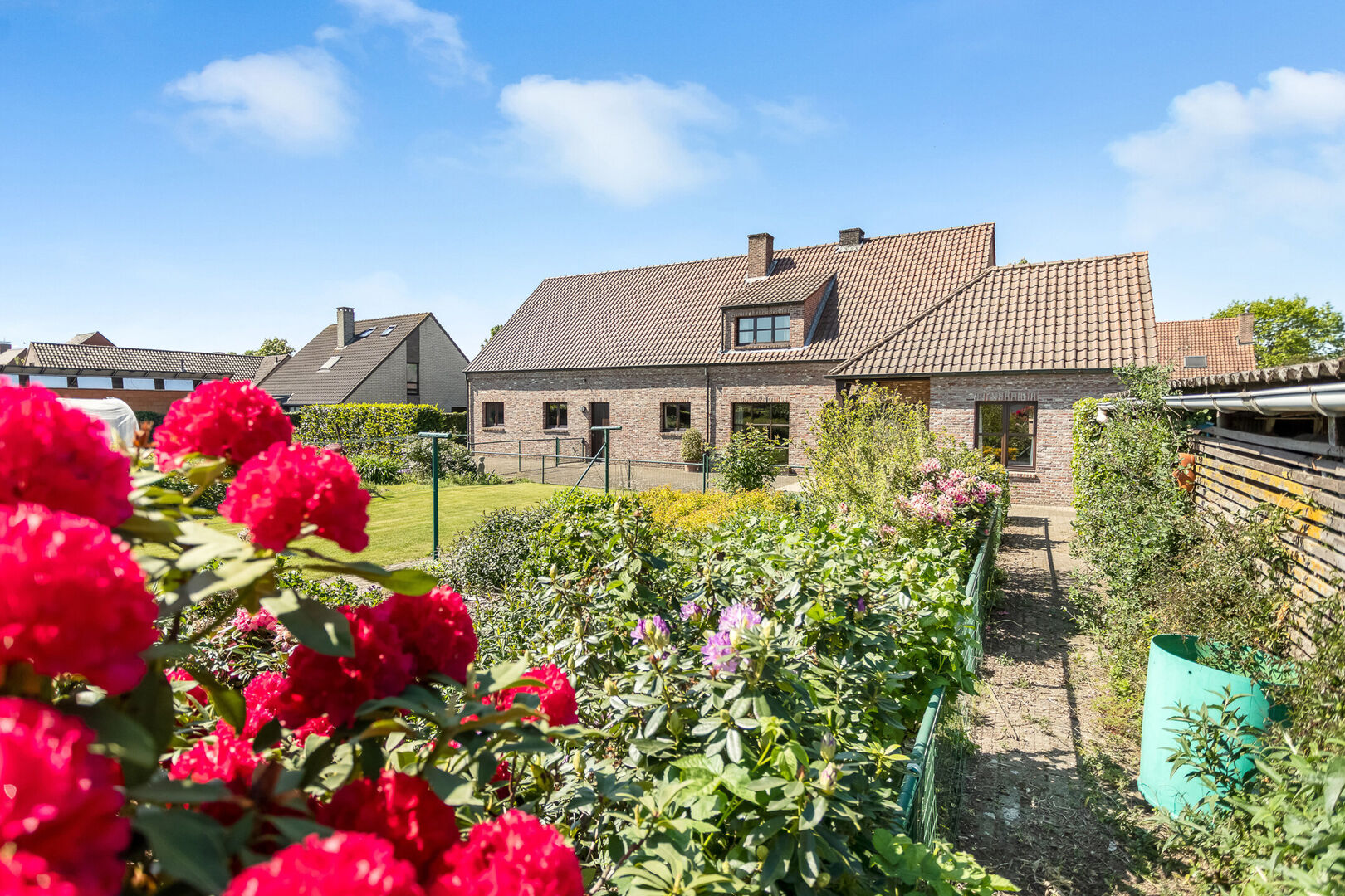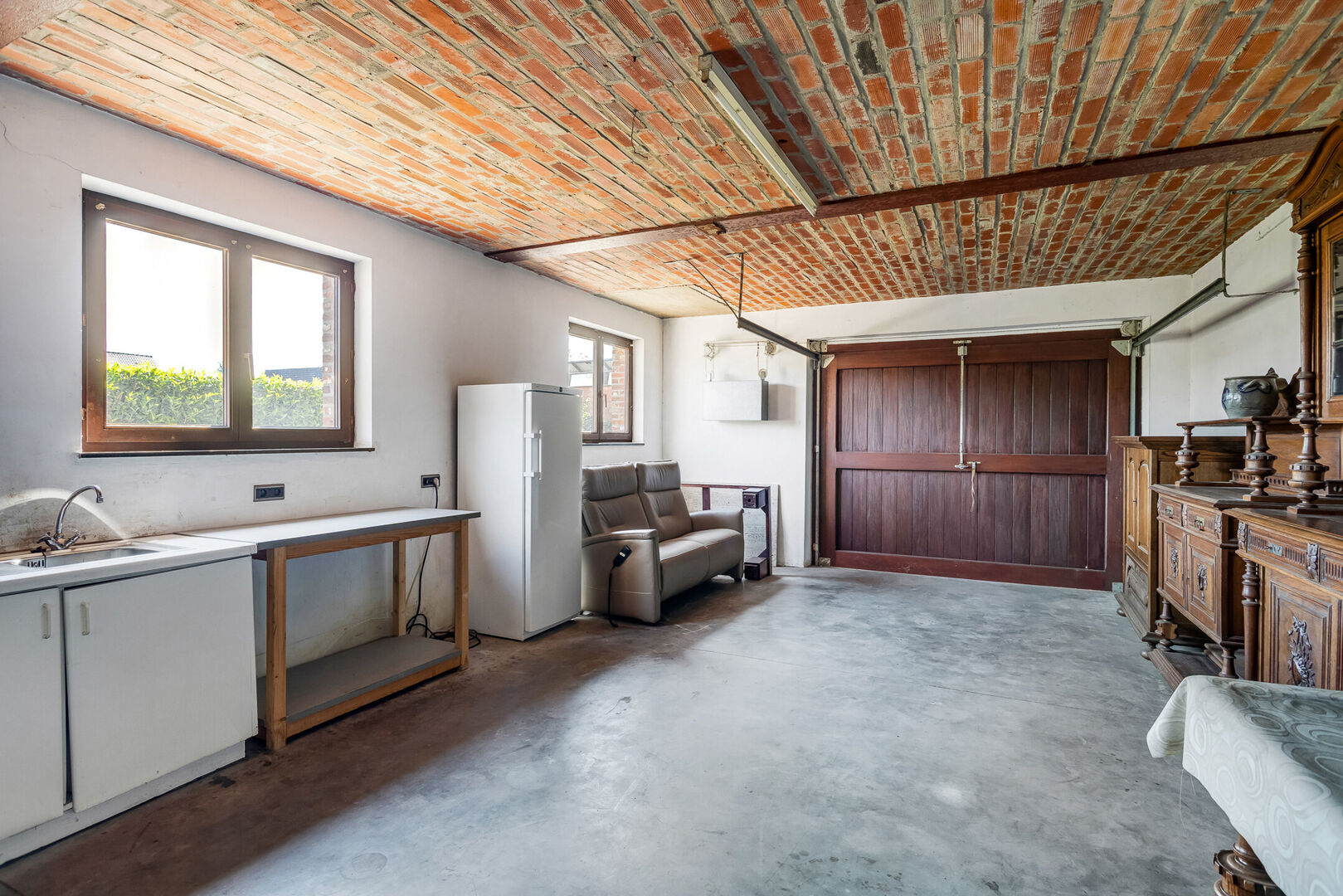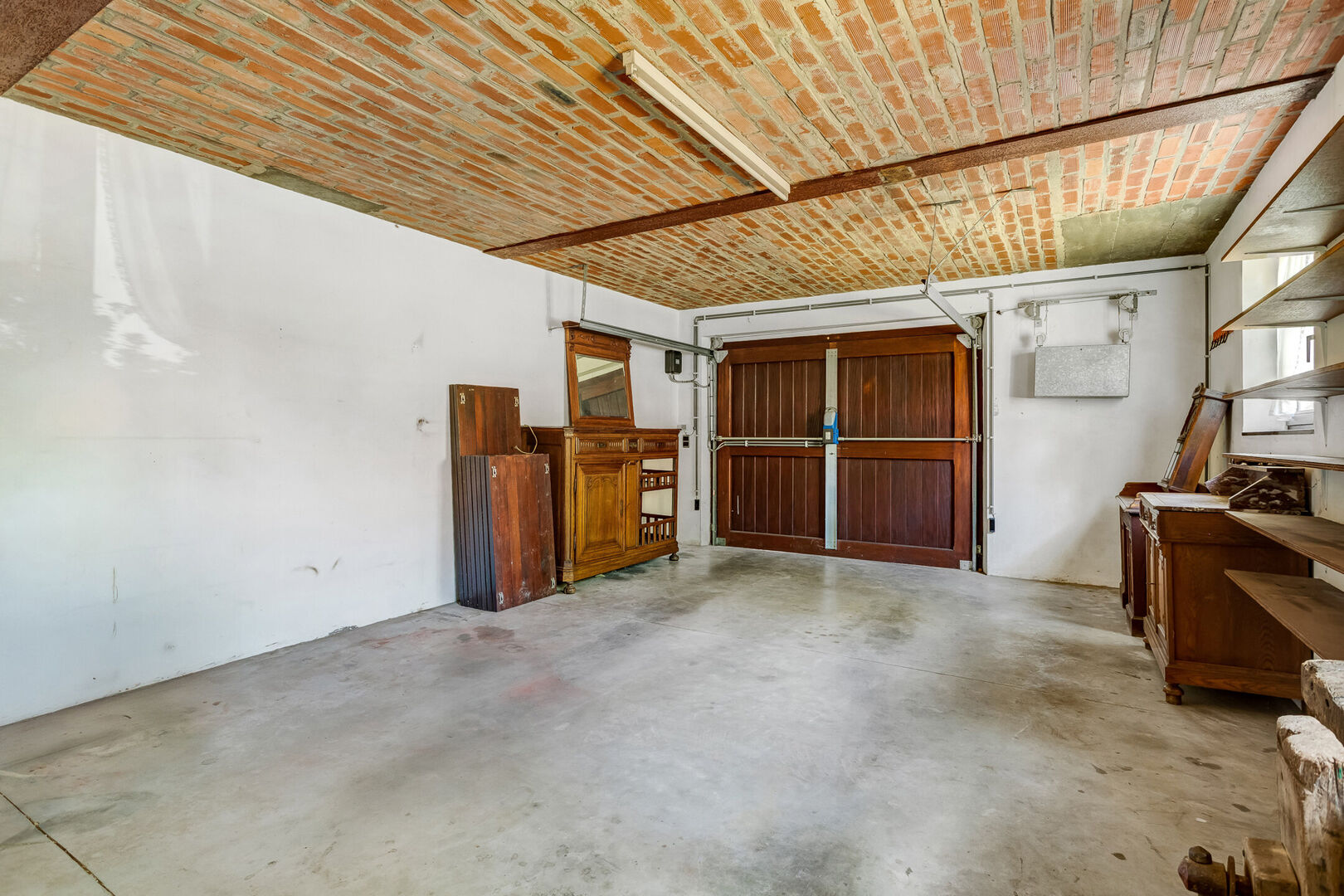 Op het gelijkvloers vinden we een ruime leefruimte, een lichtrijke keuken, een hal met een apart toilet, een berging, een badkamer, een slaapkamer en 2 zeer ruime garages.