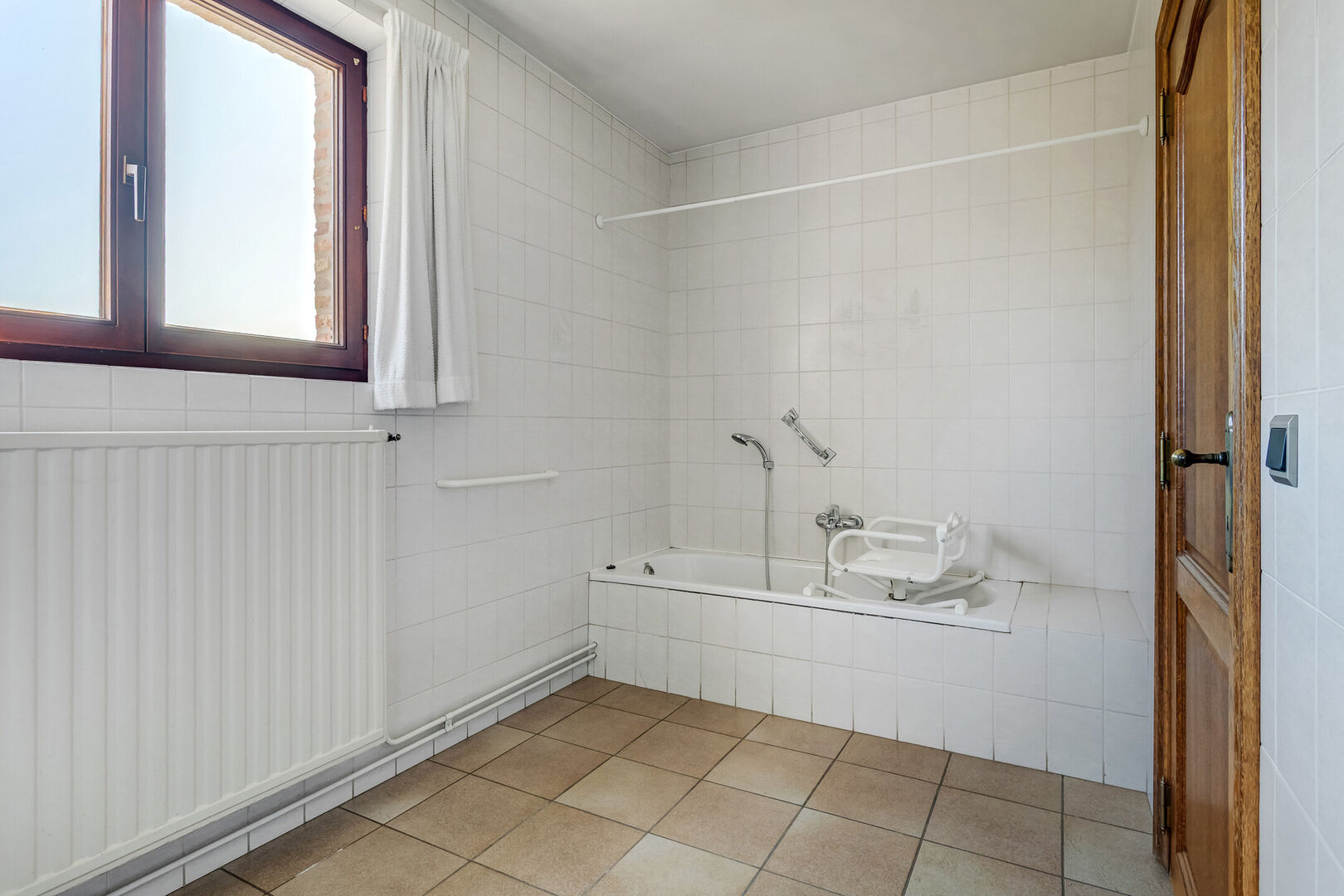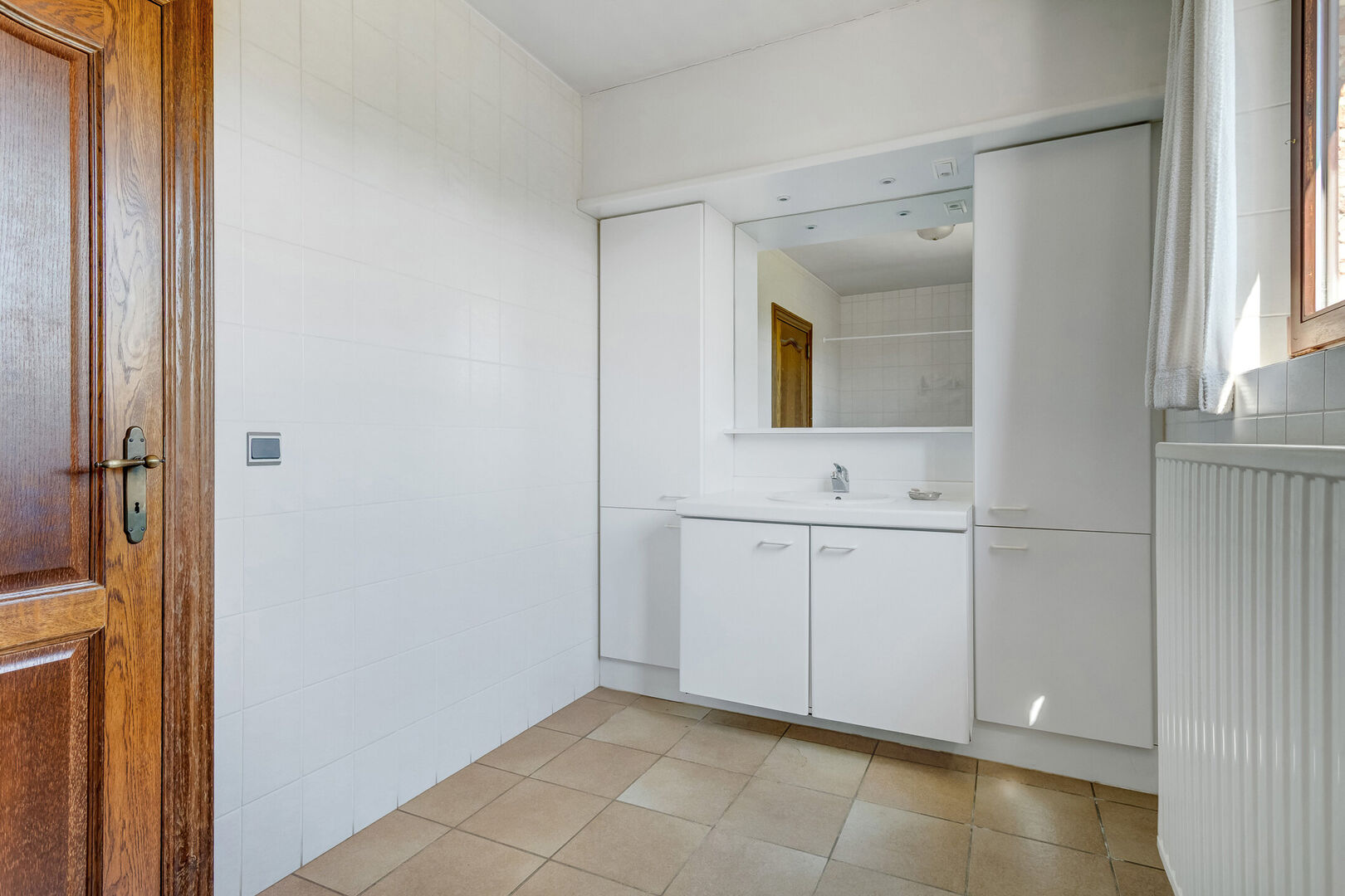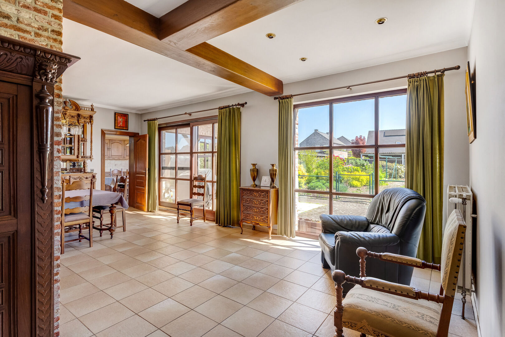 Op het gelijkvloers vinden we een ruime leefruimte, een lichtrijke keuken, een hal met een apart toilet, een berging, een badkamer, een slaapkamer en 2 zeer ruime garages.