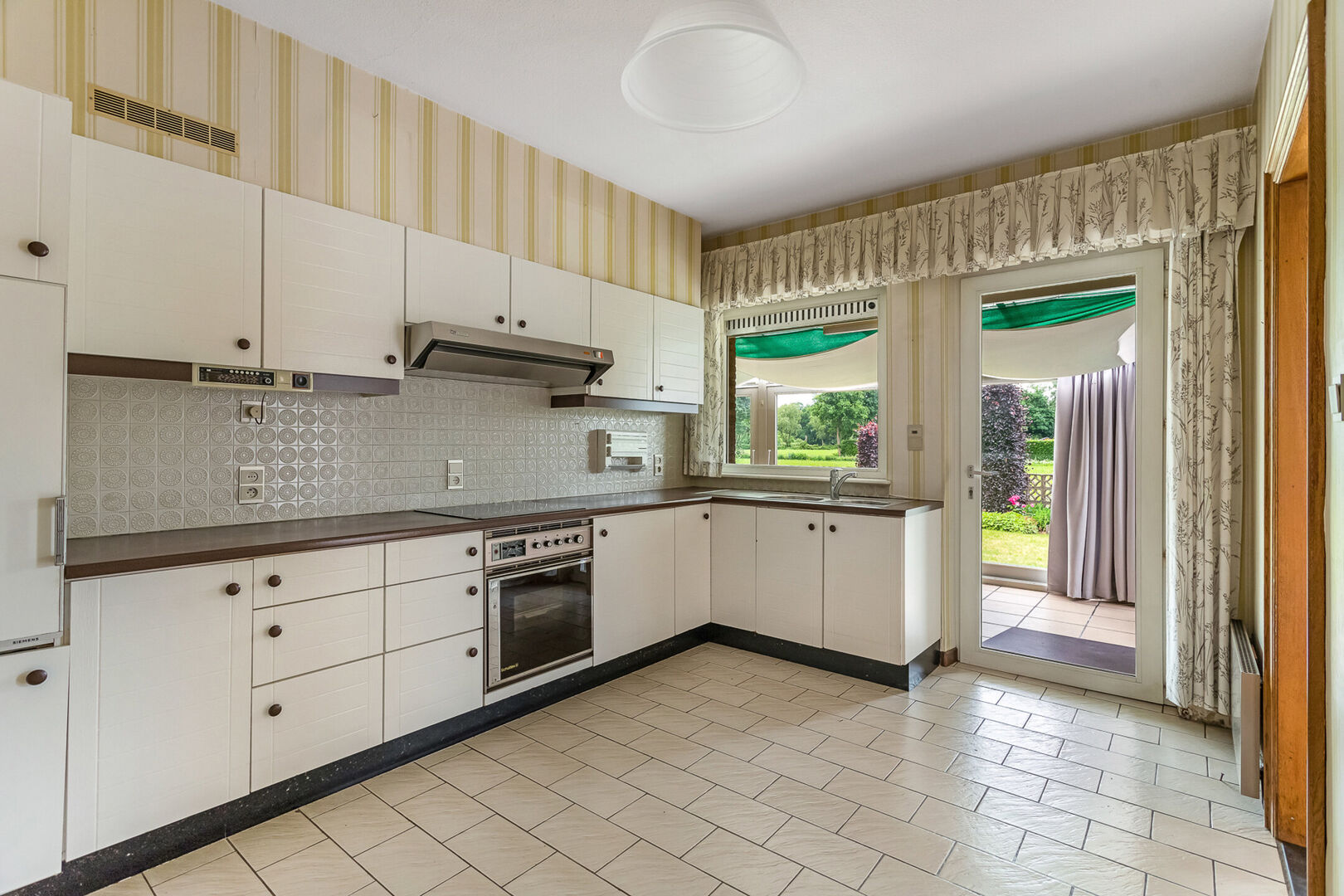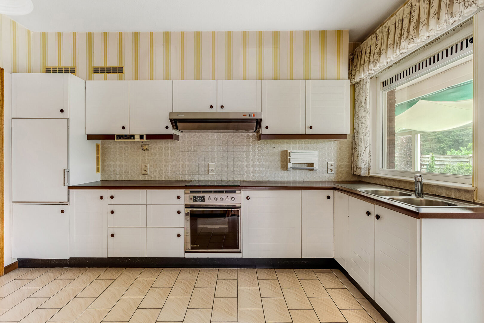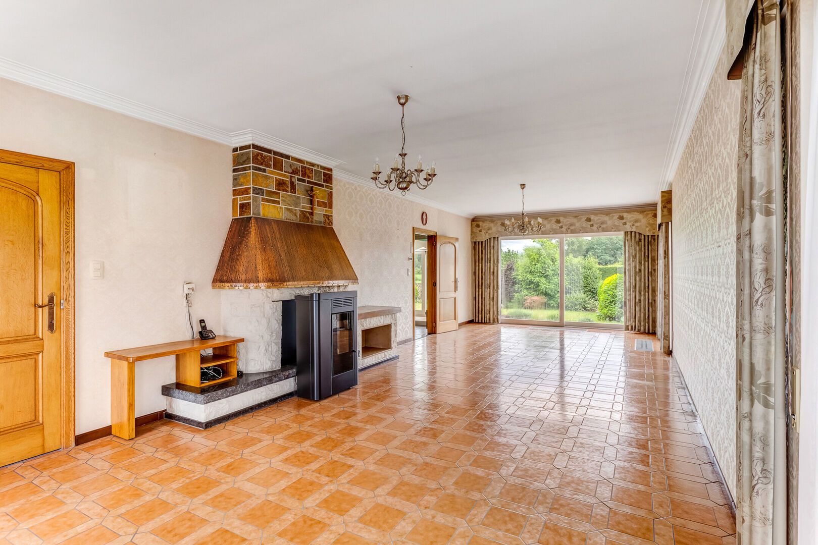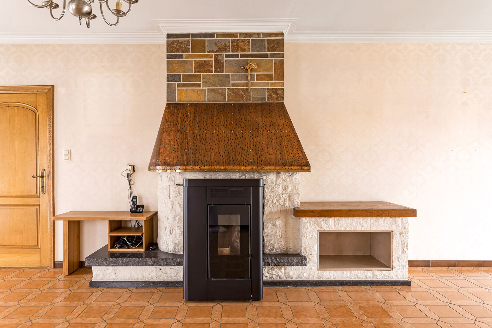 Via de inkomhal kan je rechts naar de ruime woonkamer met zicht op de tuin. Deze woonkamer is voorzien van een recente pelletkachel en door de verschillende ramen goed voorzien van daglicht. Aansluitend komen we in de geïnstalleerde keuken.
