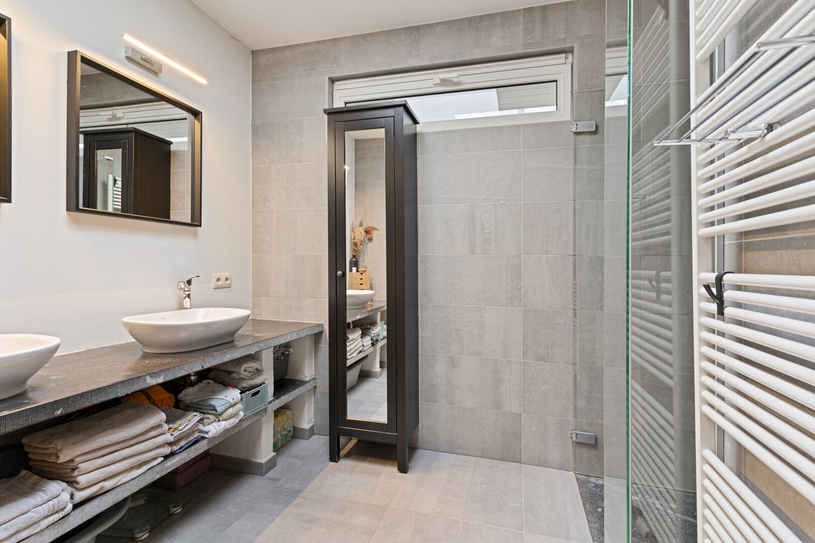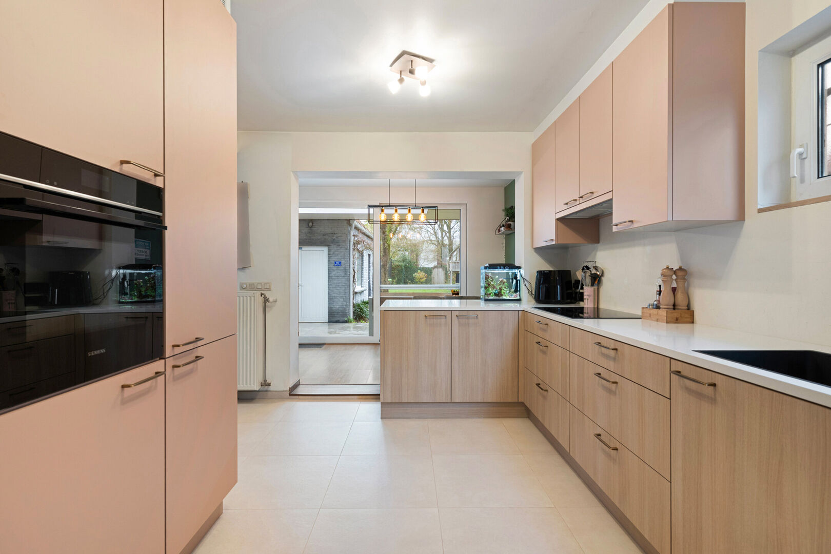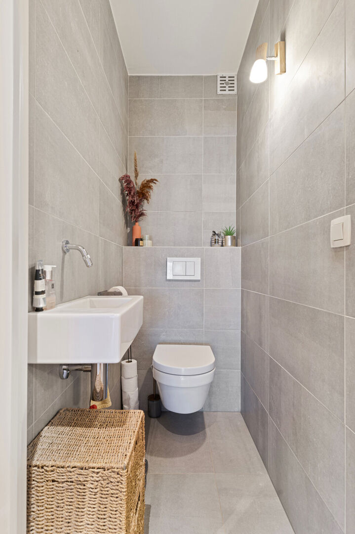 Op de gelijkvloerse verdieping verwelkomt een lichtrijke leefruimte je met een volledig vernieuwde open keuken, waar gezelligheid en samenzijn centraal staan. Grote ramen laten overvloedig daglicht binnen en geven uit op de groene tuin. Het ruime overdekte terras maakt elk seizoen aangenaam — perfect voor gezellige avonden met vrienden of ontspannen momenten met het gezin. Aansluitend vind je een royale badkamer, een apart toilet, kelder, bergruimtes en een praktische wasplaats.
