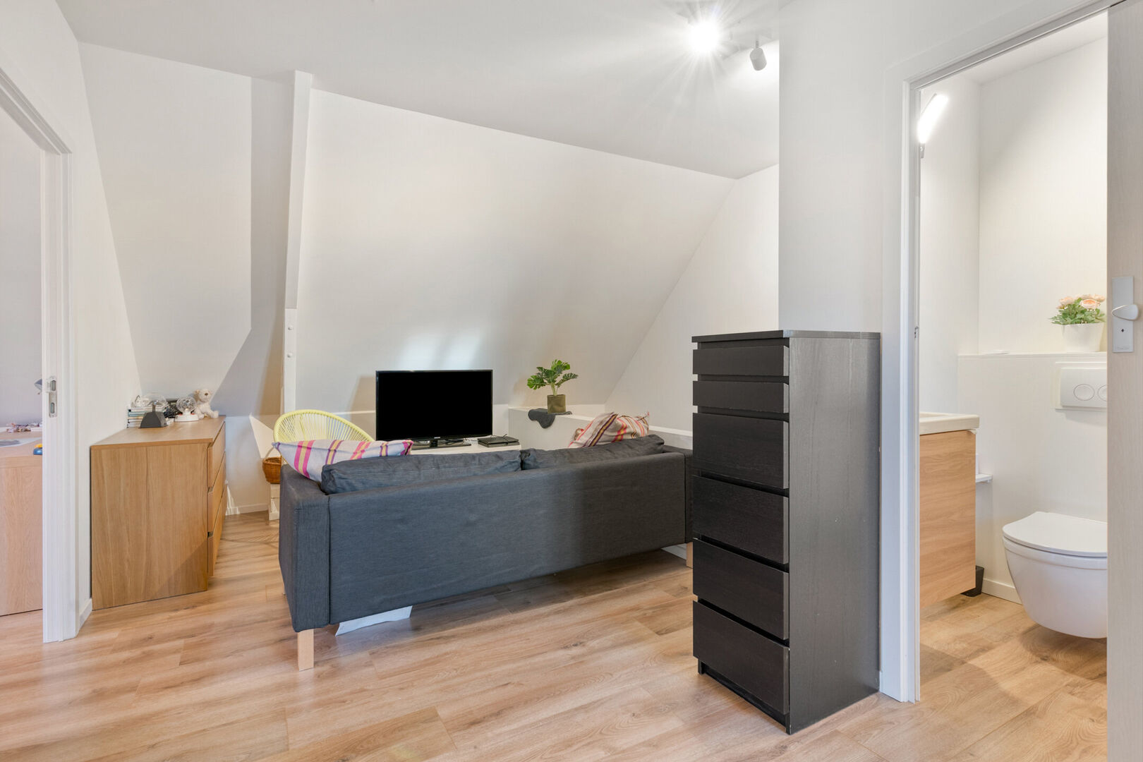 De eerste verdieping telt drie gelijkwaardige slaapkamers. De badkamer boven is functioneel ingericht en bevindt zich dicht bij de kamers, net zoals het afzonderlijk toilet. De nachthal leidt naar de charmante zolderverdieping met 2 slaapkamers, toilet en ontspanningsruimte.