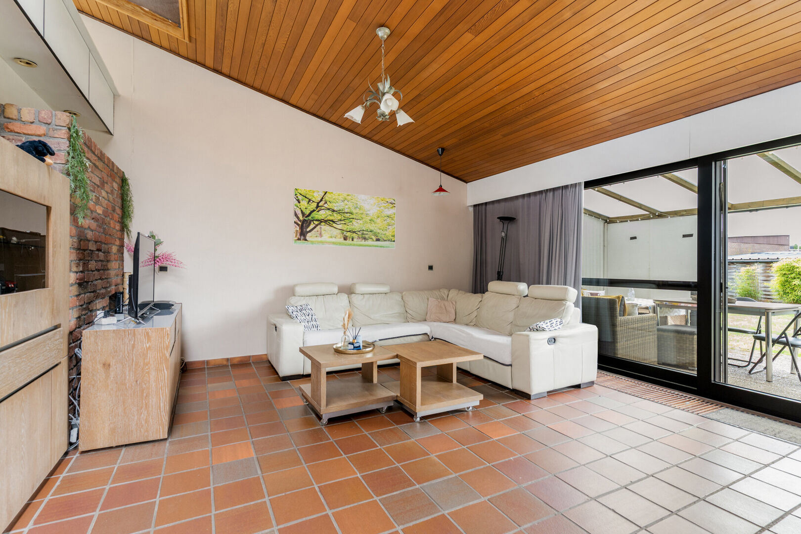 De ruime woonkamer kijkt uit over de tuin en baadt in natuurlijk licht, dankzij de grote raampartijen.