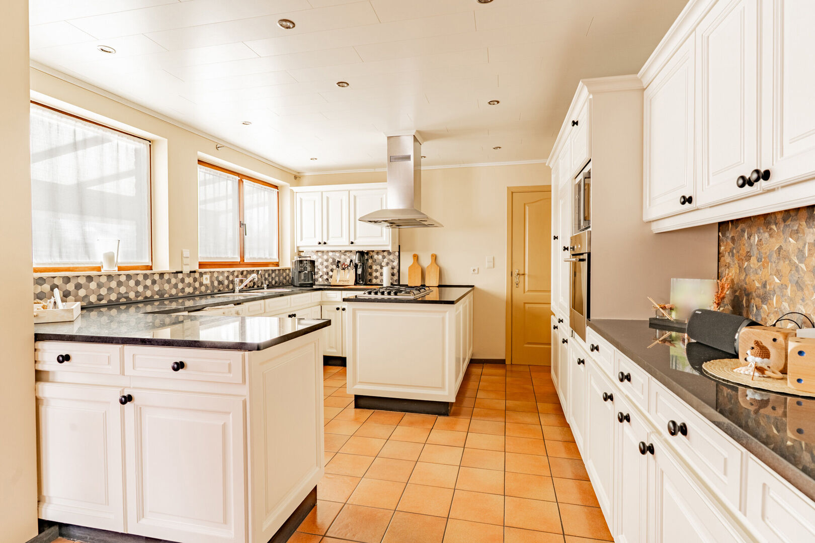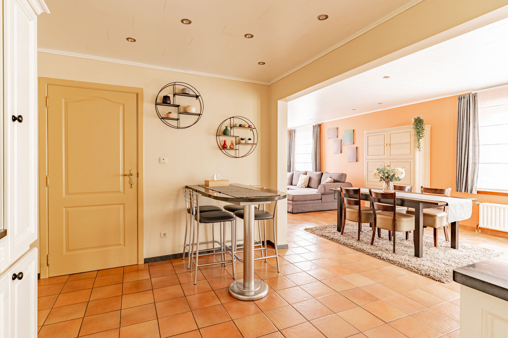 De ruimte kreeg enkele jaren geleden een stijlvolle update, waardoor ze perfect aansluit bij de keuken ernaast.
