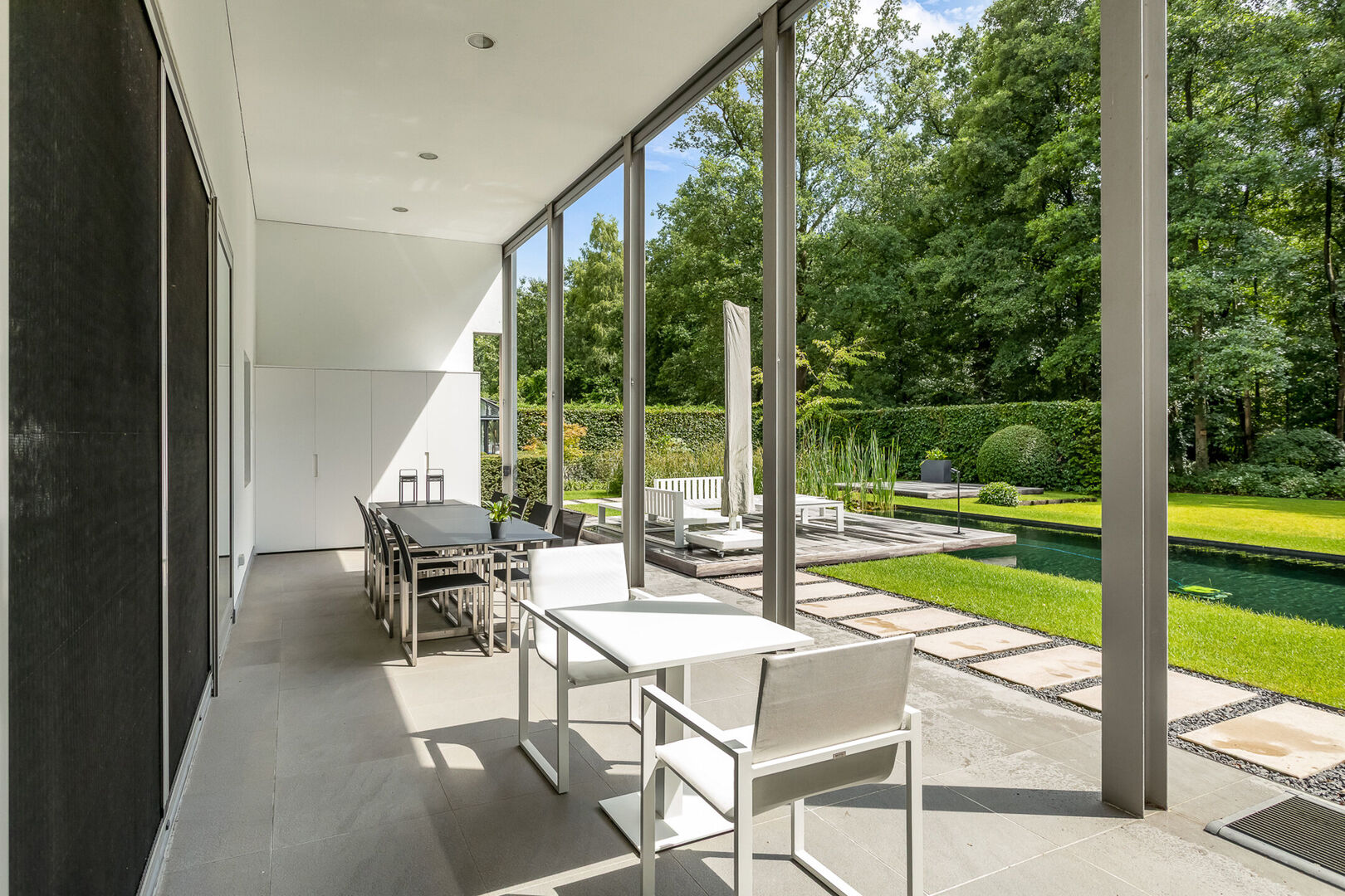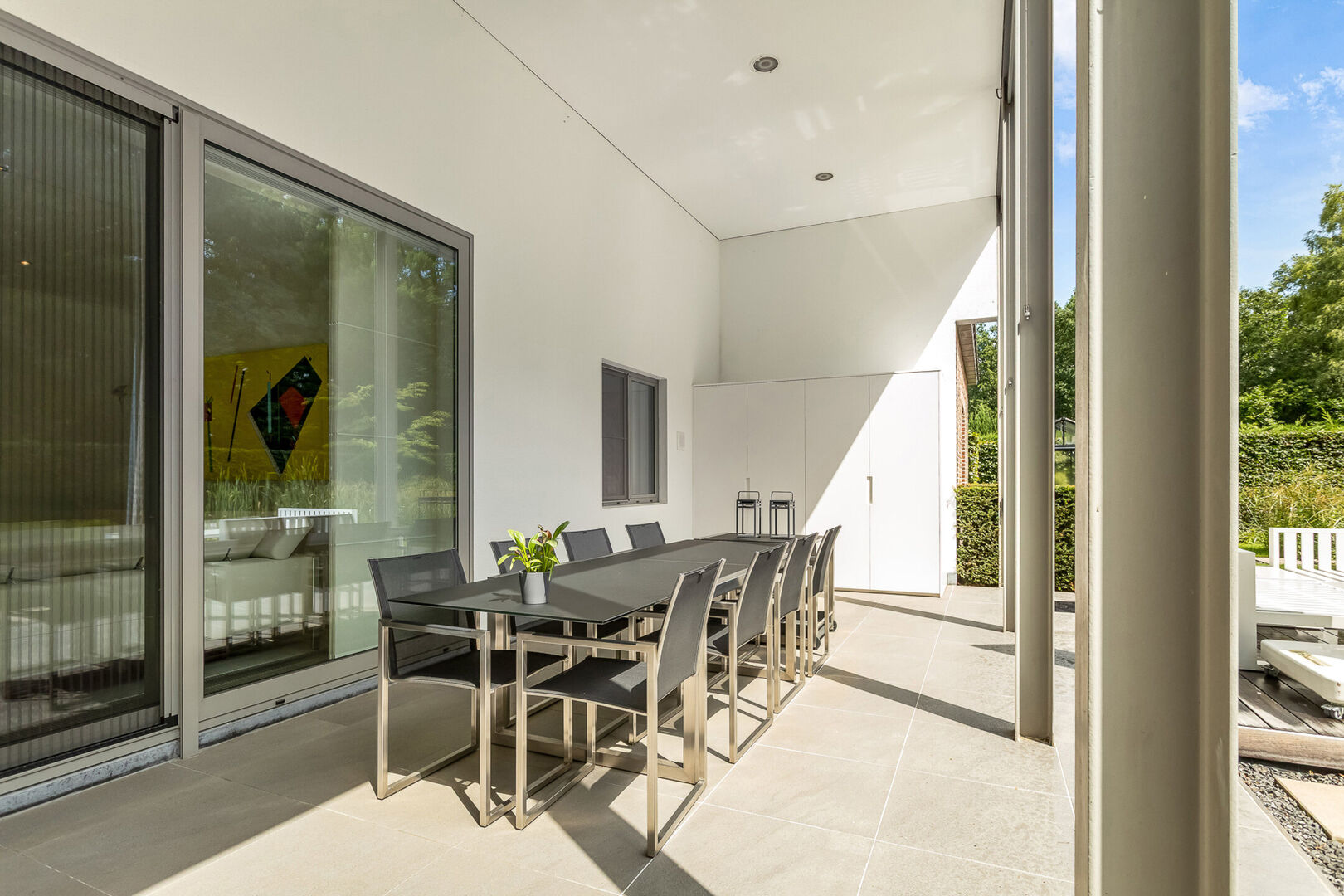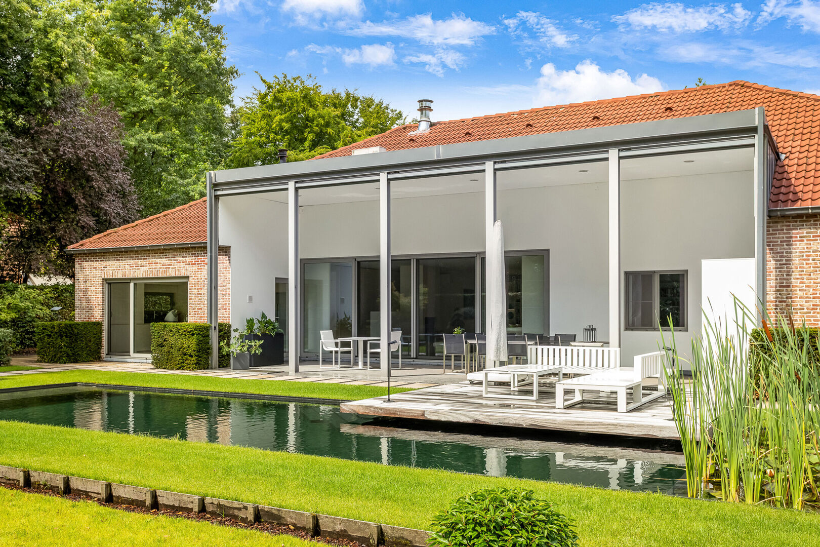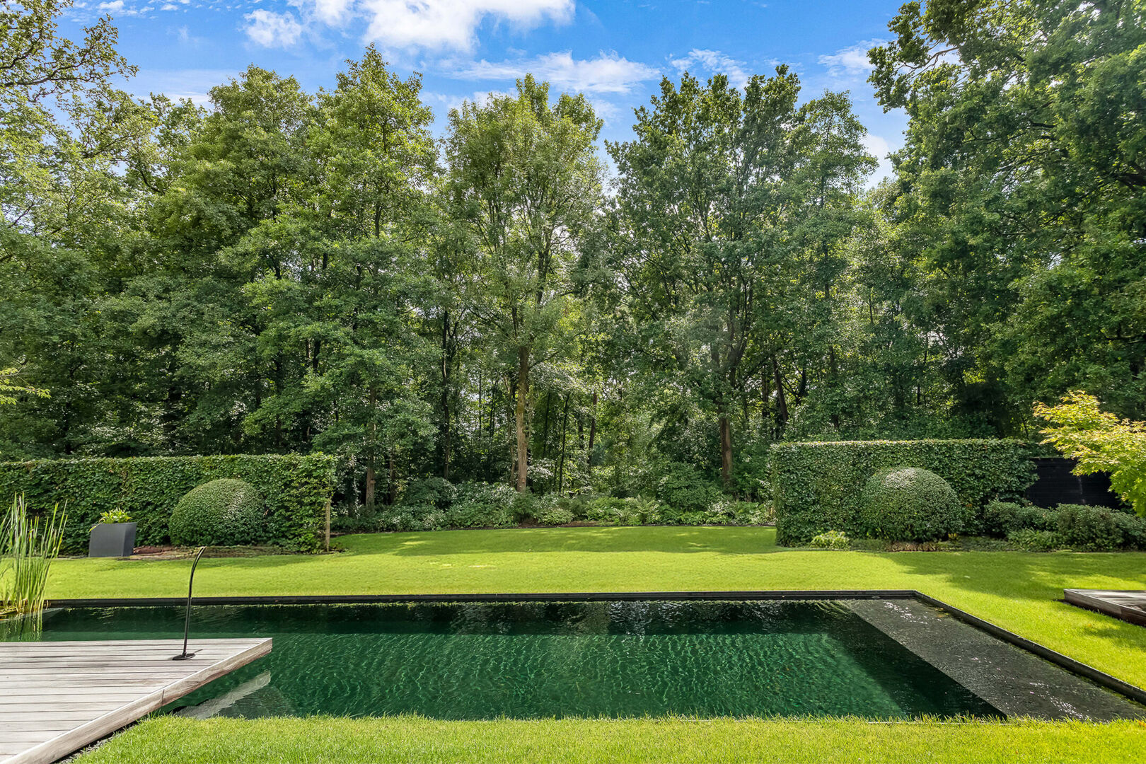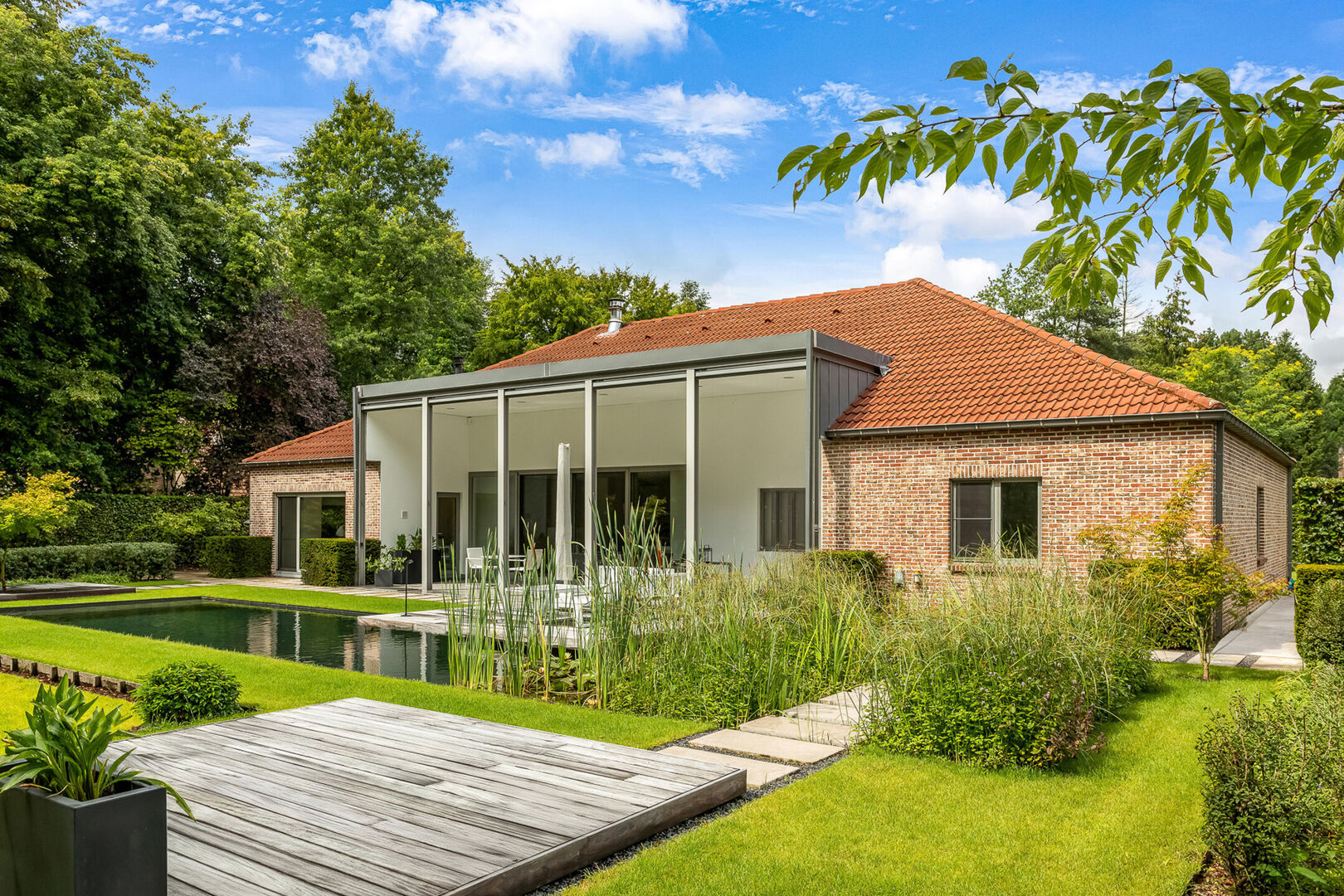 De buitenruimte is net zo doordacht als het interieur: een modern aangelegde, onderhoudsvriendelijke tuin met drie aparte terrassen, een royaal overdekt terras aan de woning met automatische screens, een ecologisch zwembad met roldek, twee tuinbergingen en een sfeervol bospartij achteraan het perceel.