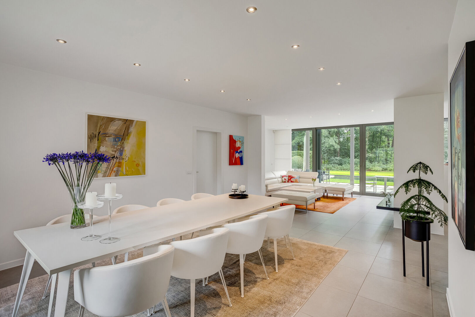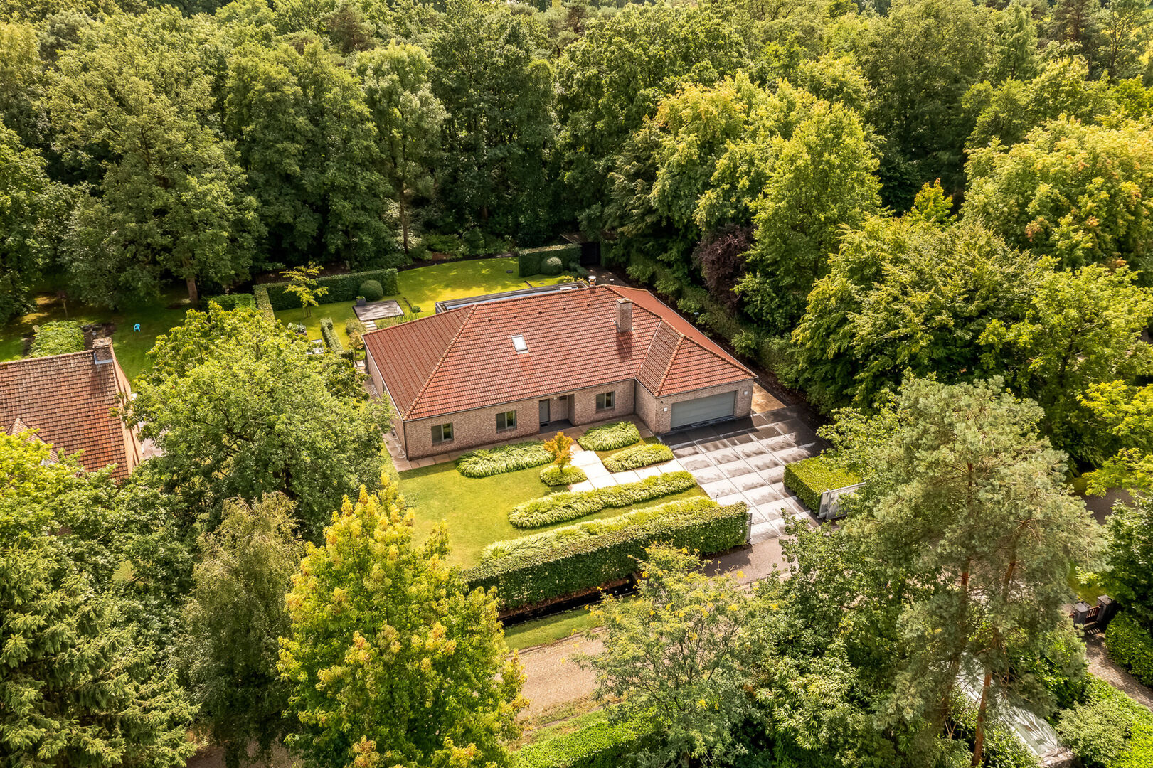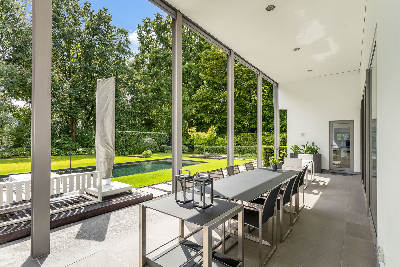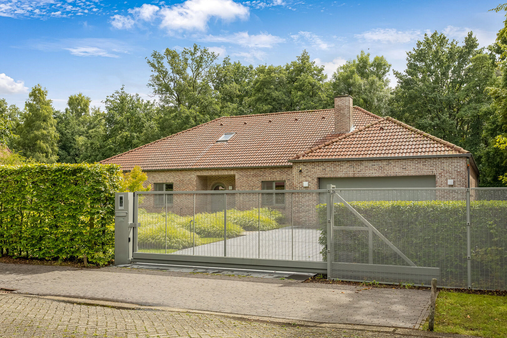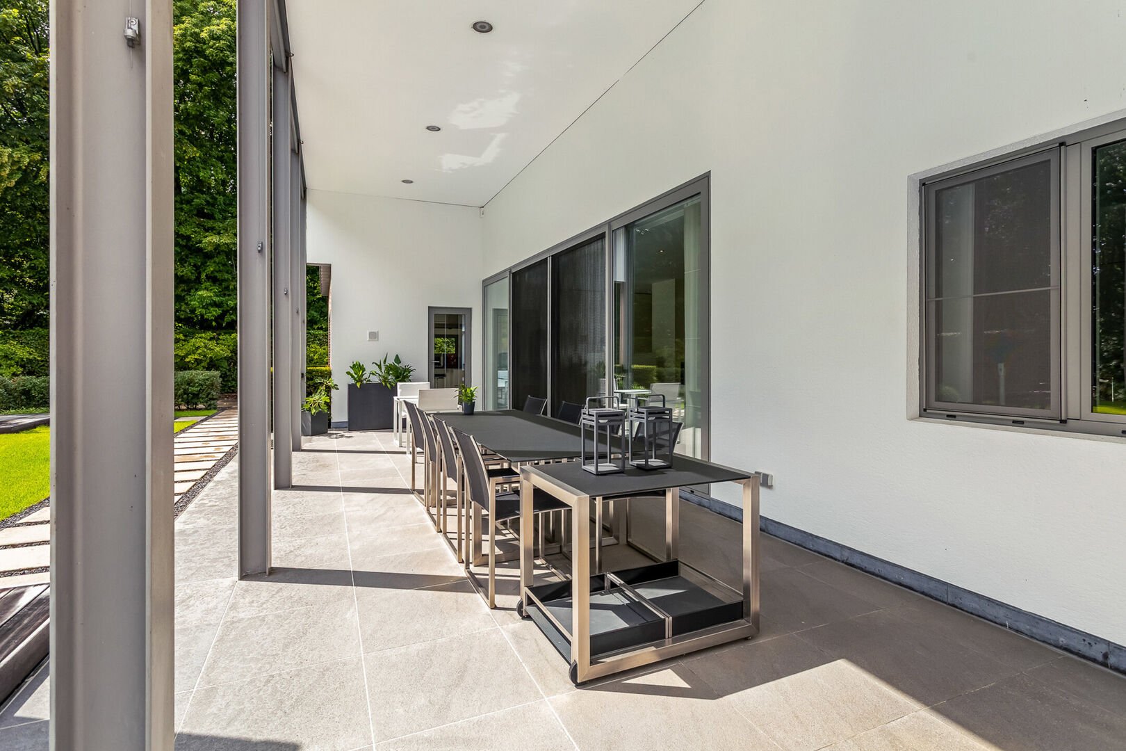 De buitenruimte is net zo doordacht als het interieur: een modern aangelegde, onderhoudsvriendelijke tuin met drie aparte terrassen, een royaal overdekt terras aan de woning met automatische screens, een ecologisch zwembad met roldek, twee tuinbergingen en een sfeervol bospartij achteraan het perceel.