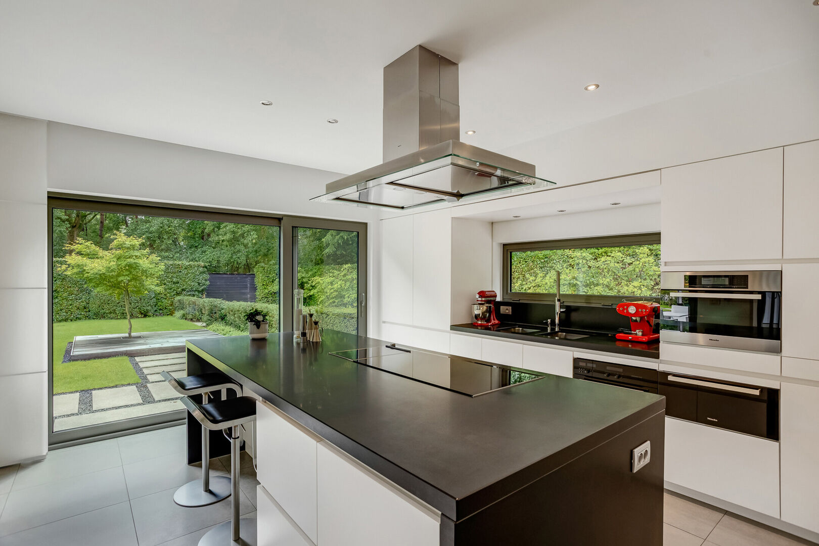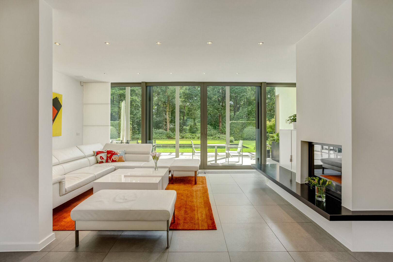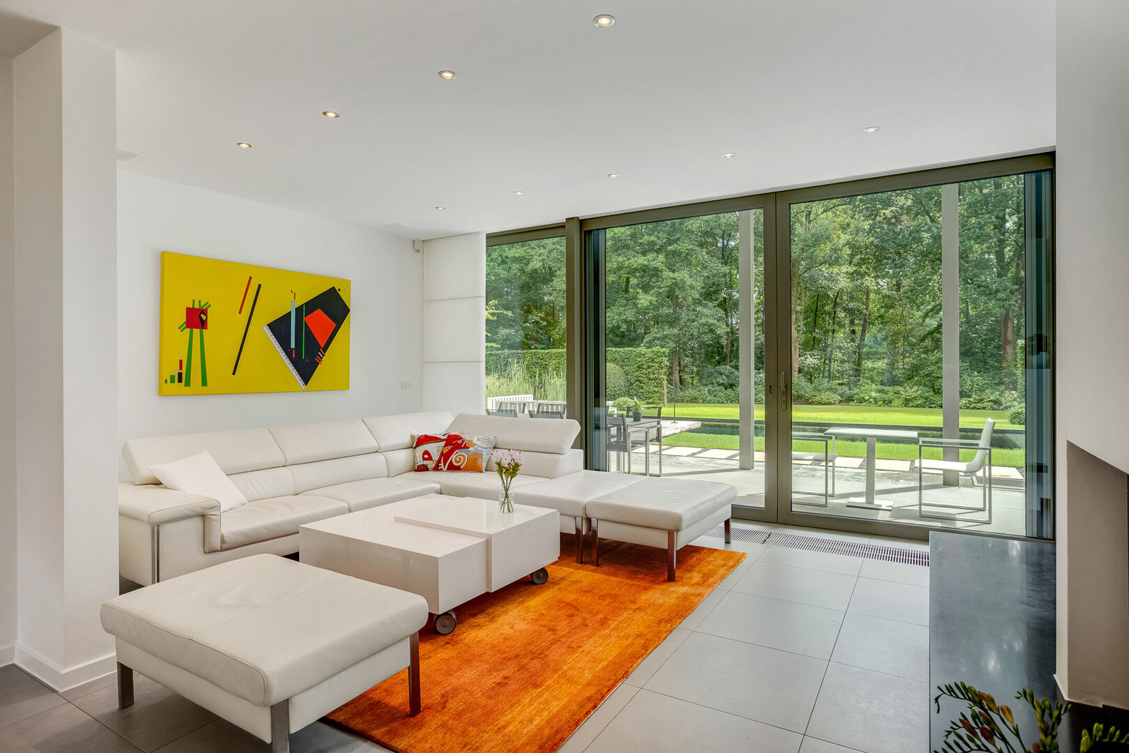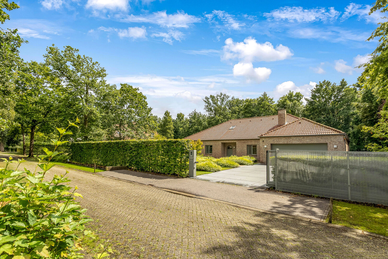 De buitenruimte is net zo doordacht als het interieur: een modern aangelegde, onderhoudsvriendelijke tuin met drie aparte terrassen, een royaal overdekt terras aan de woning met automatische screens, een ecologisch zwembad met roldek, twee tuinbergingen en een sfeervol bospartij achteraan het perceel.