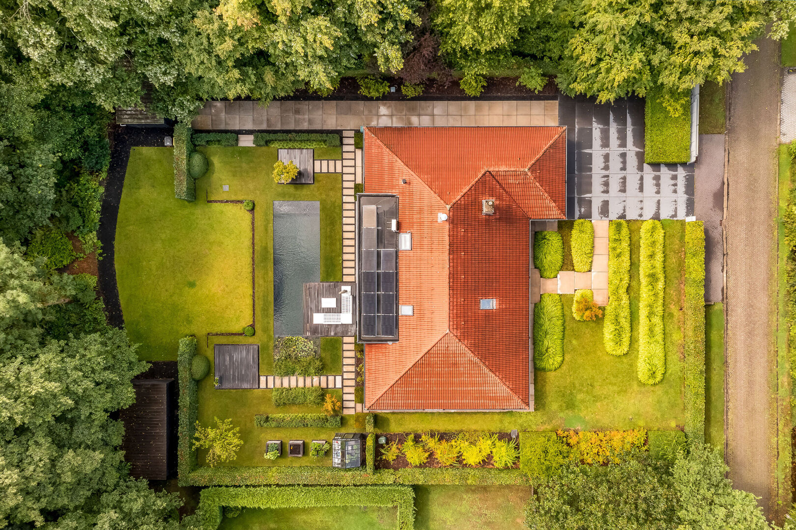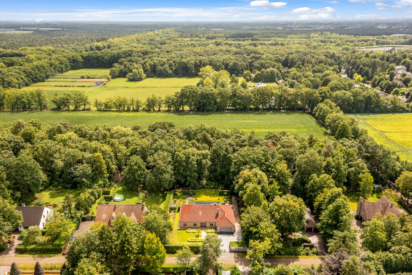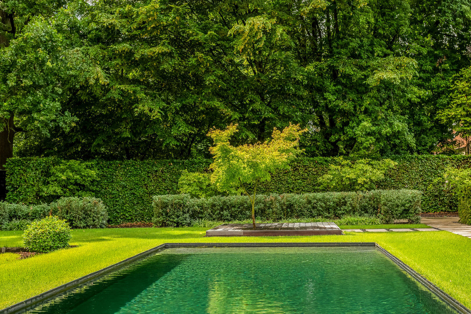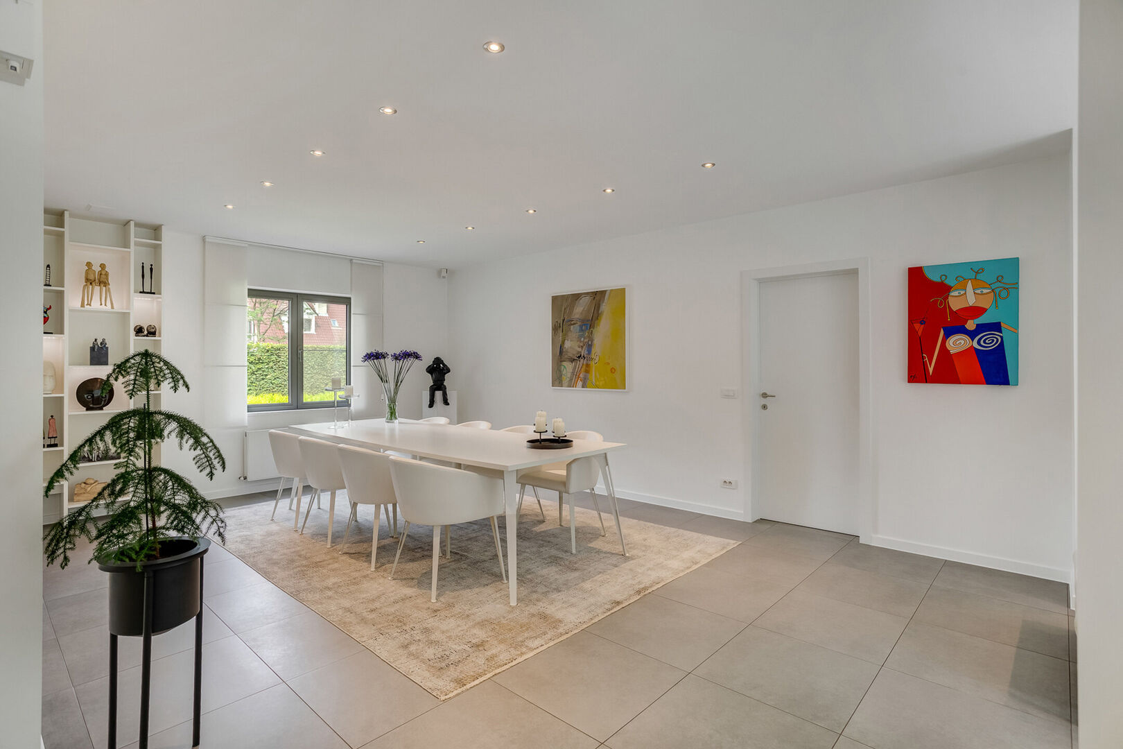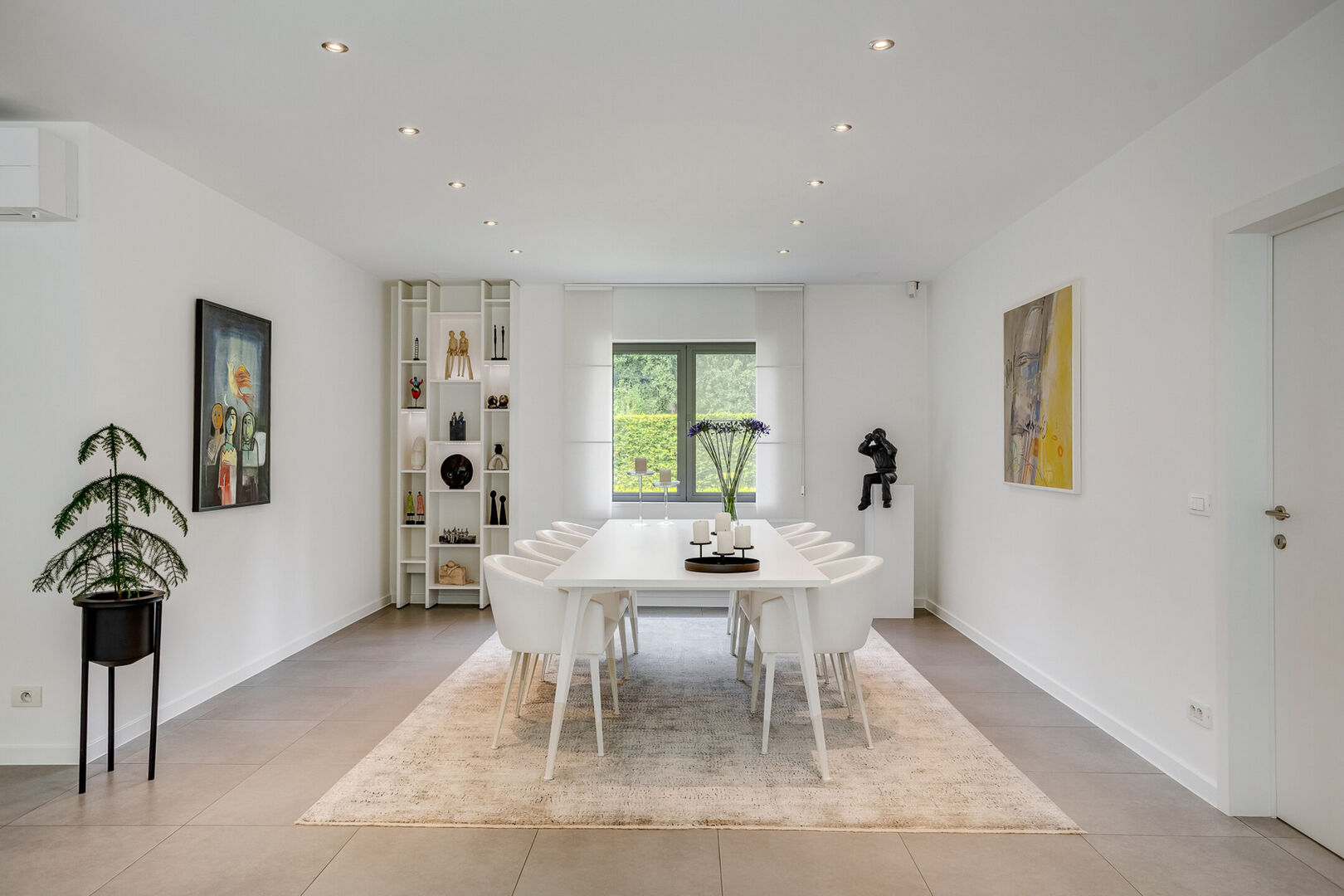 De buitenruimte is net zo doordacht als het interieur: een modern aangelegde, onderhoudsvriendelijke tuin met drie aparte terrassen, een royaal overdekt terras aan de woning met automatische screens, een ecologisch zwembad met roldek, twee tuinbergingen en een sfeervol bospartij achteraan het perceel.