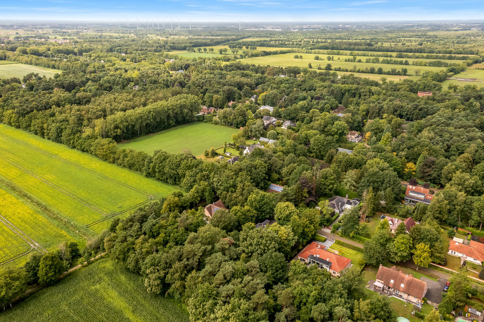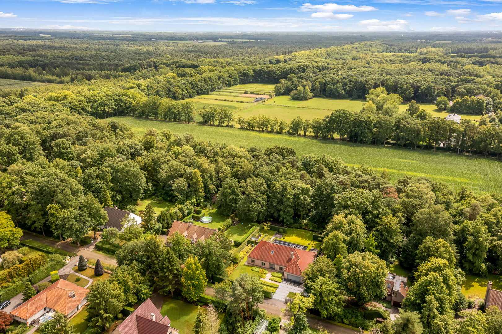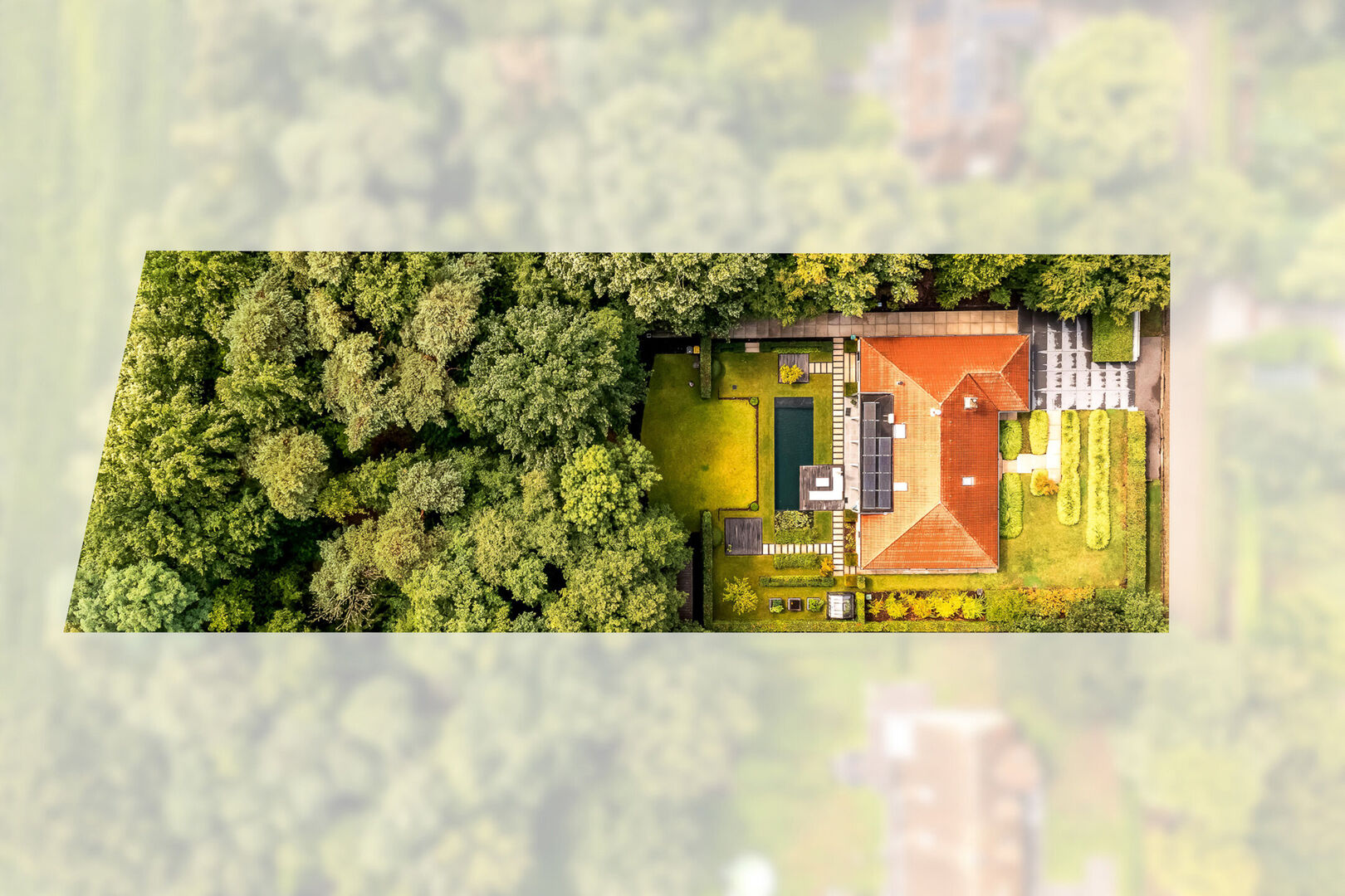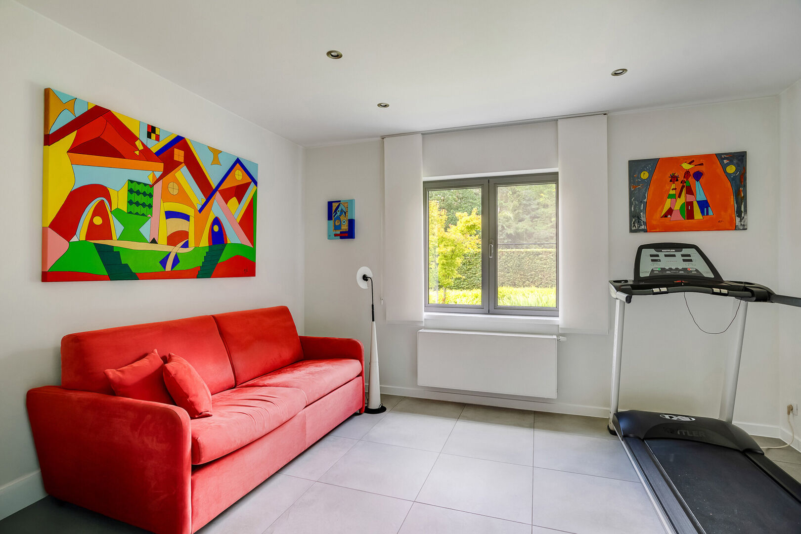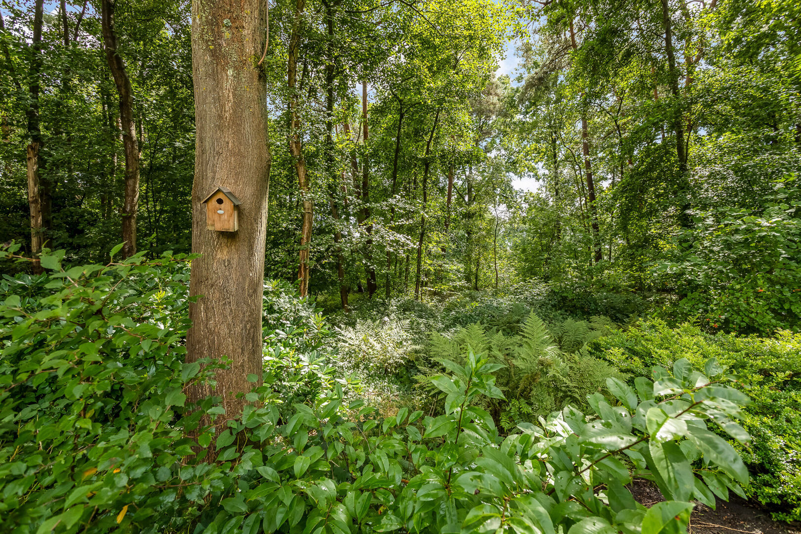 De buitenruimte is net zo doordacht als het interieur: een modern aangelegde, onderhoudsvriendelijke tuin met drie aparte terrassen, een royaal overdekt terras aan de woning met automatische screens, een ecologisch zwembad met roldek, twee tuinbergingen en een sfeervol bospartij achteraan het perceel.