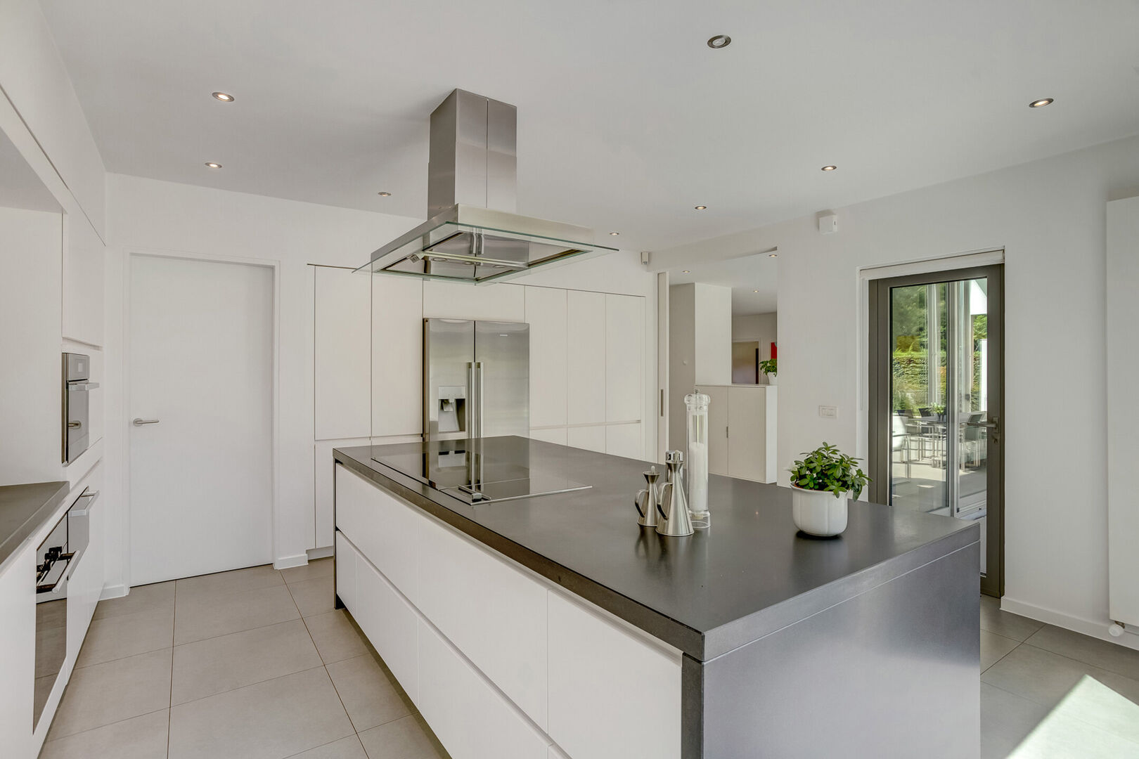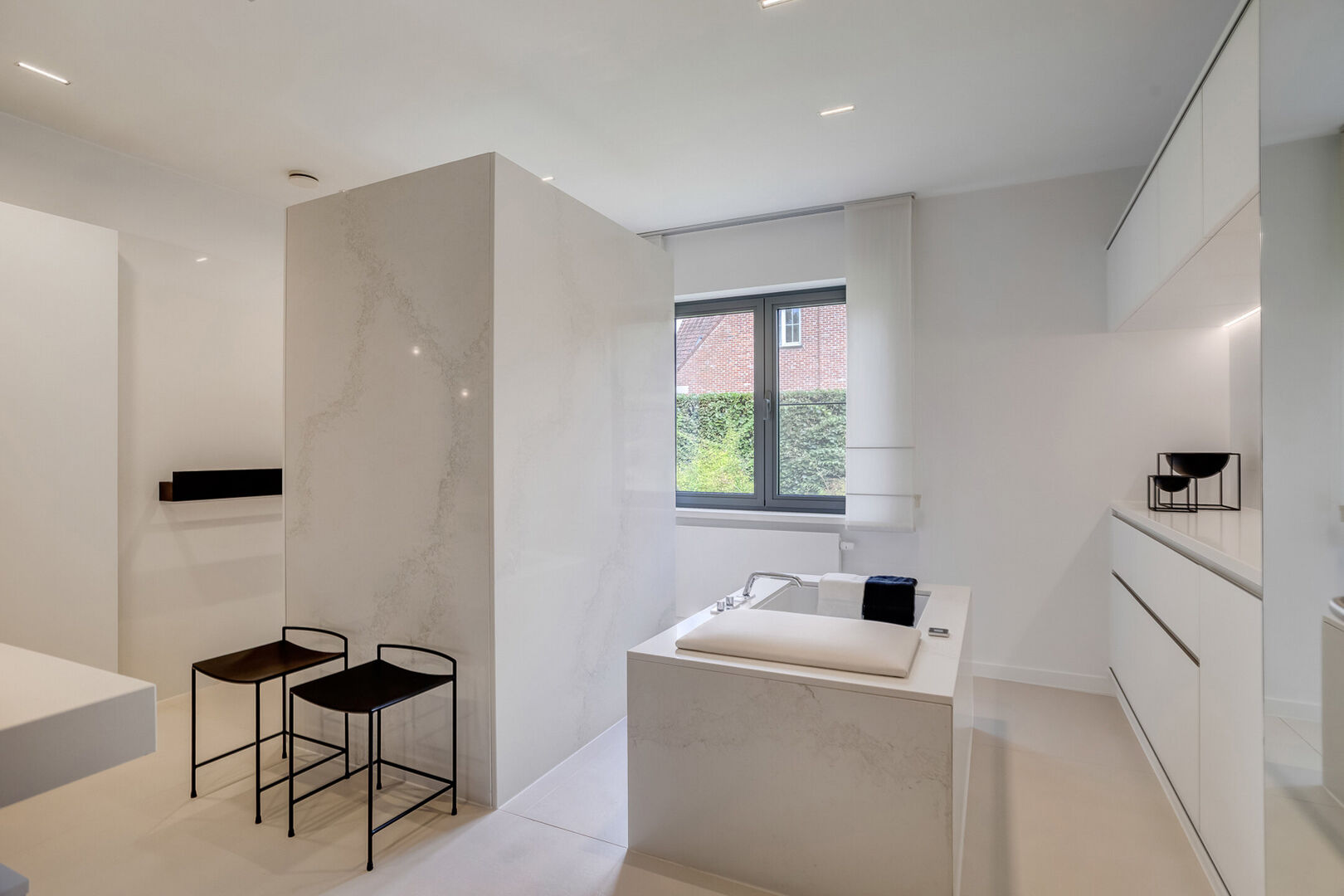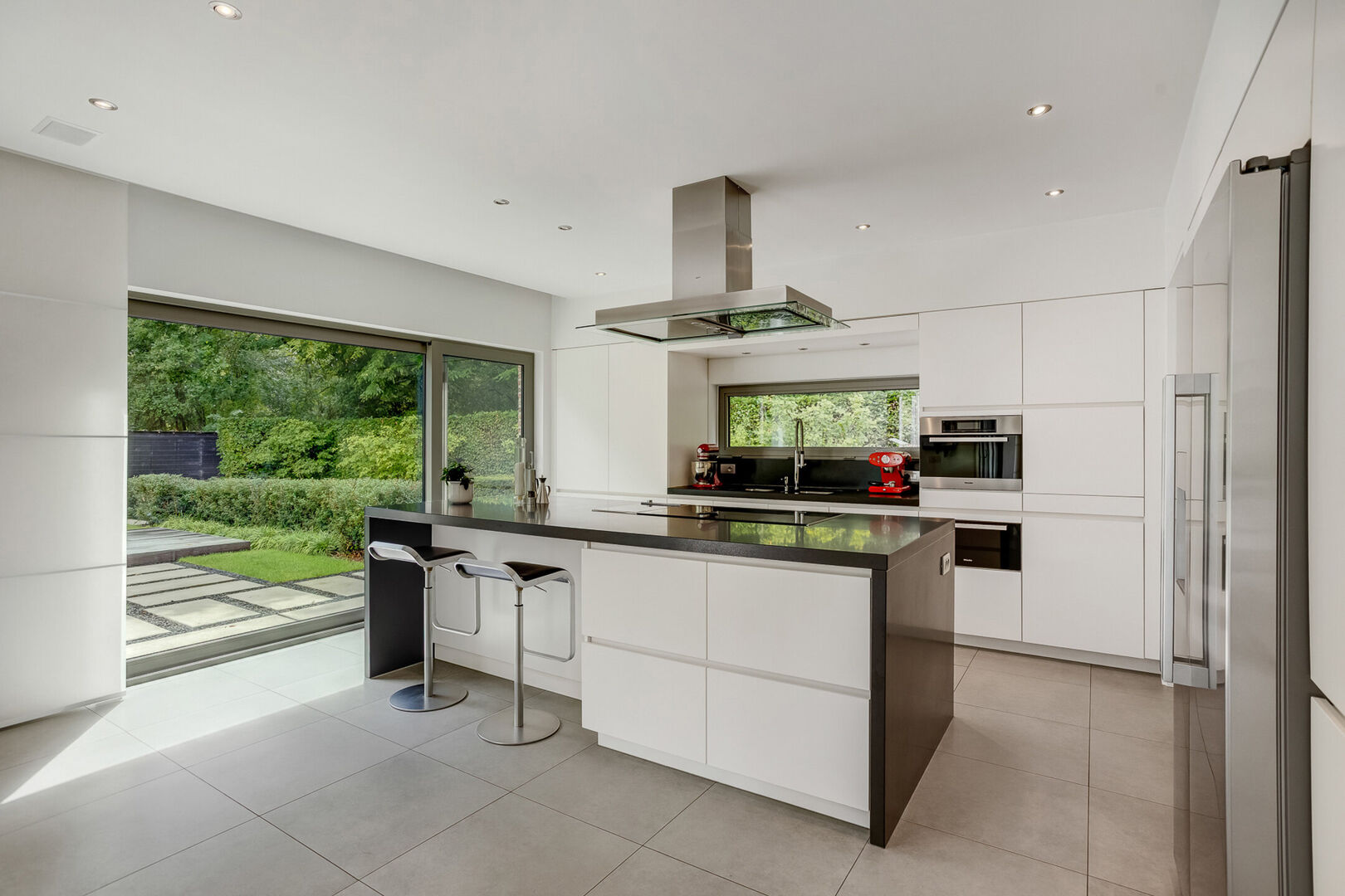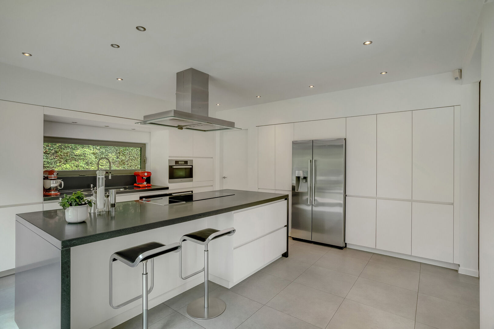 De ruime inkomhal met gastentoilet en vestiaire leidt naar een lichtrijke leefruimte met open haard, eetkamer, maatwerk wandkasten en een subtiel geïntegreerde walk-in berging. De strakke keuken met eiland sluit perfect aan op de leefruimte. Ook de praktische wasplaats en dubbele garage (met automatische poort) werden mee opgenomen in het nieuwe ontwerp.