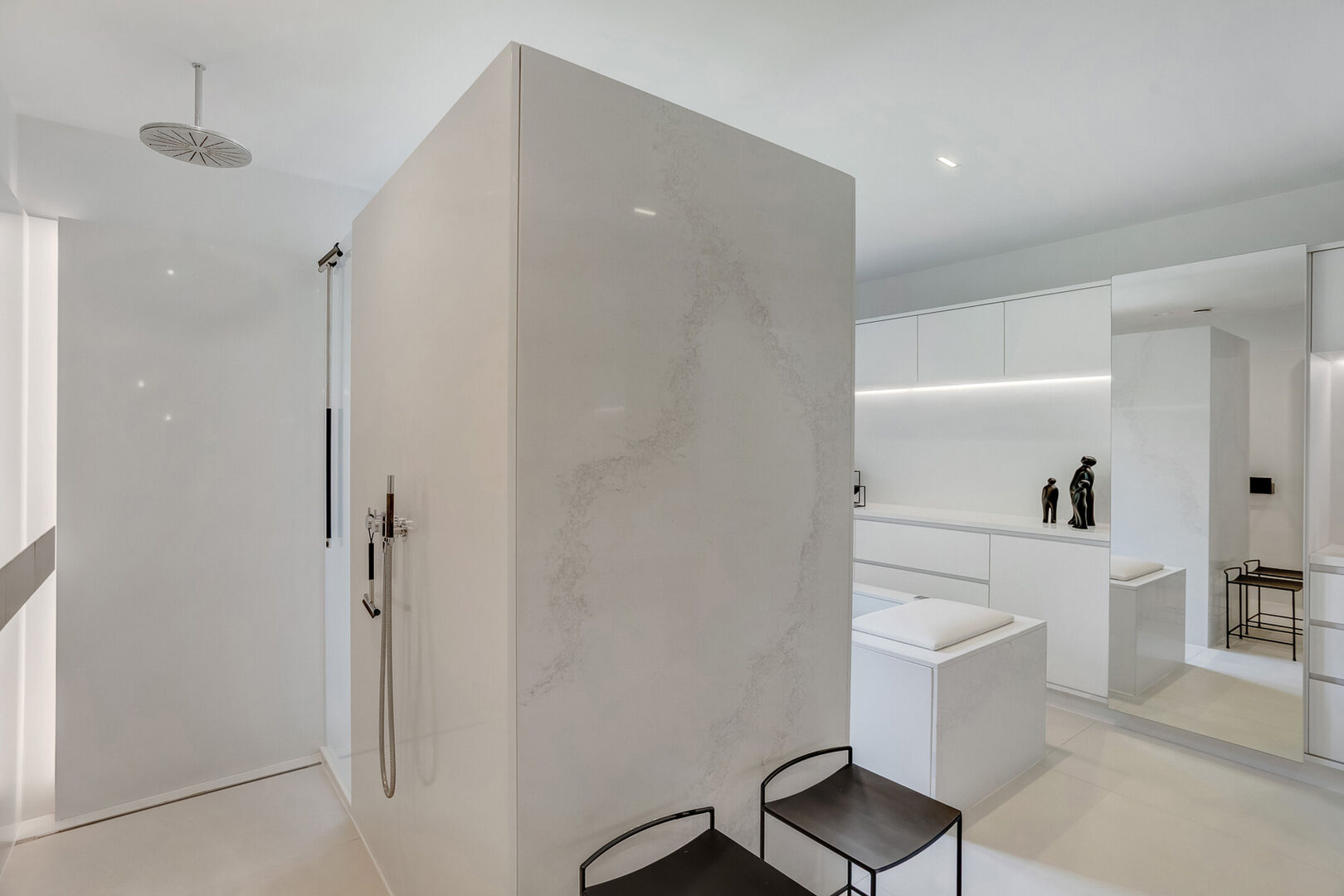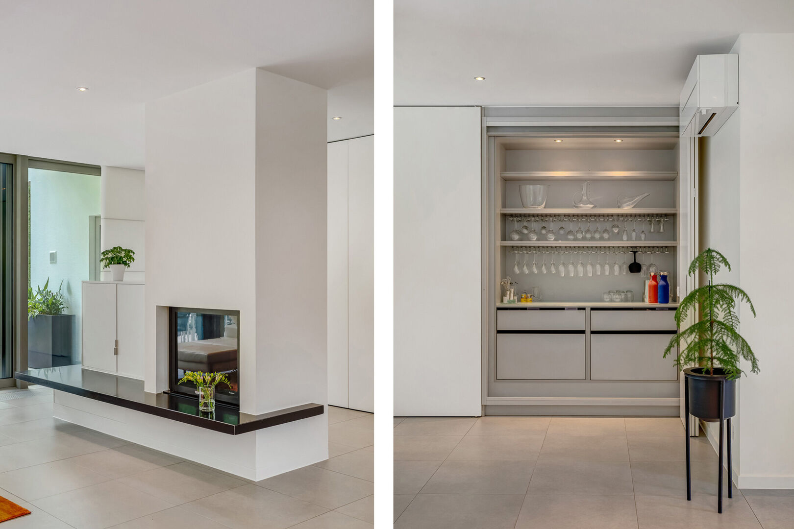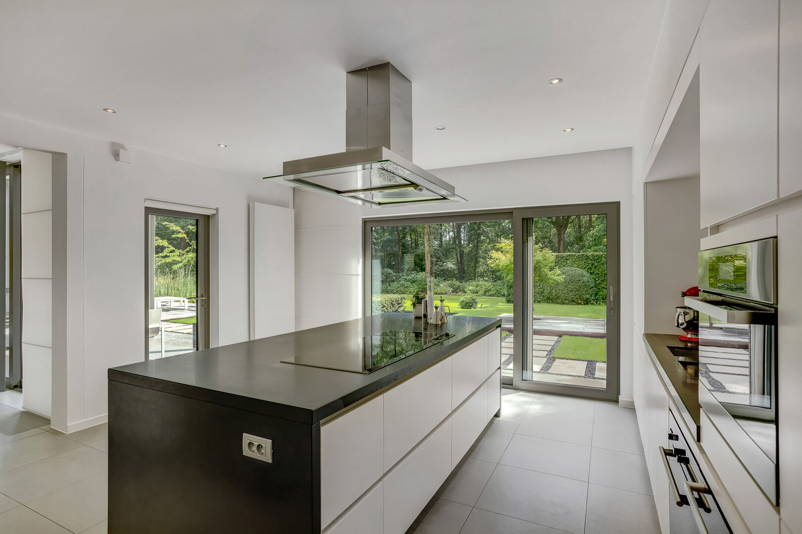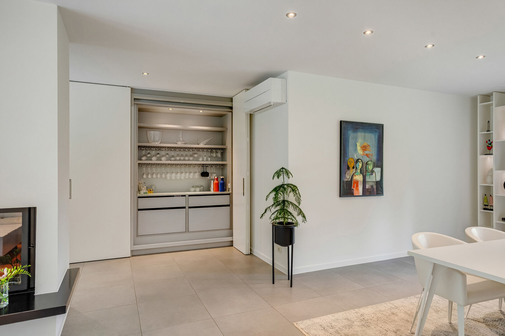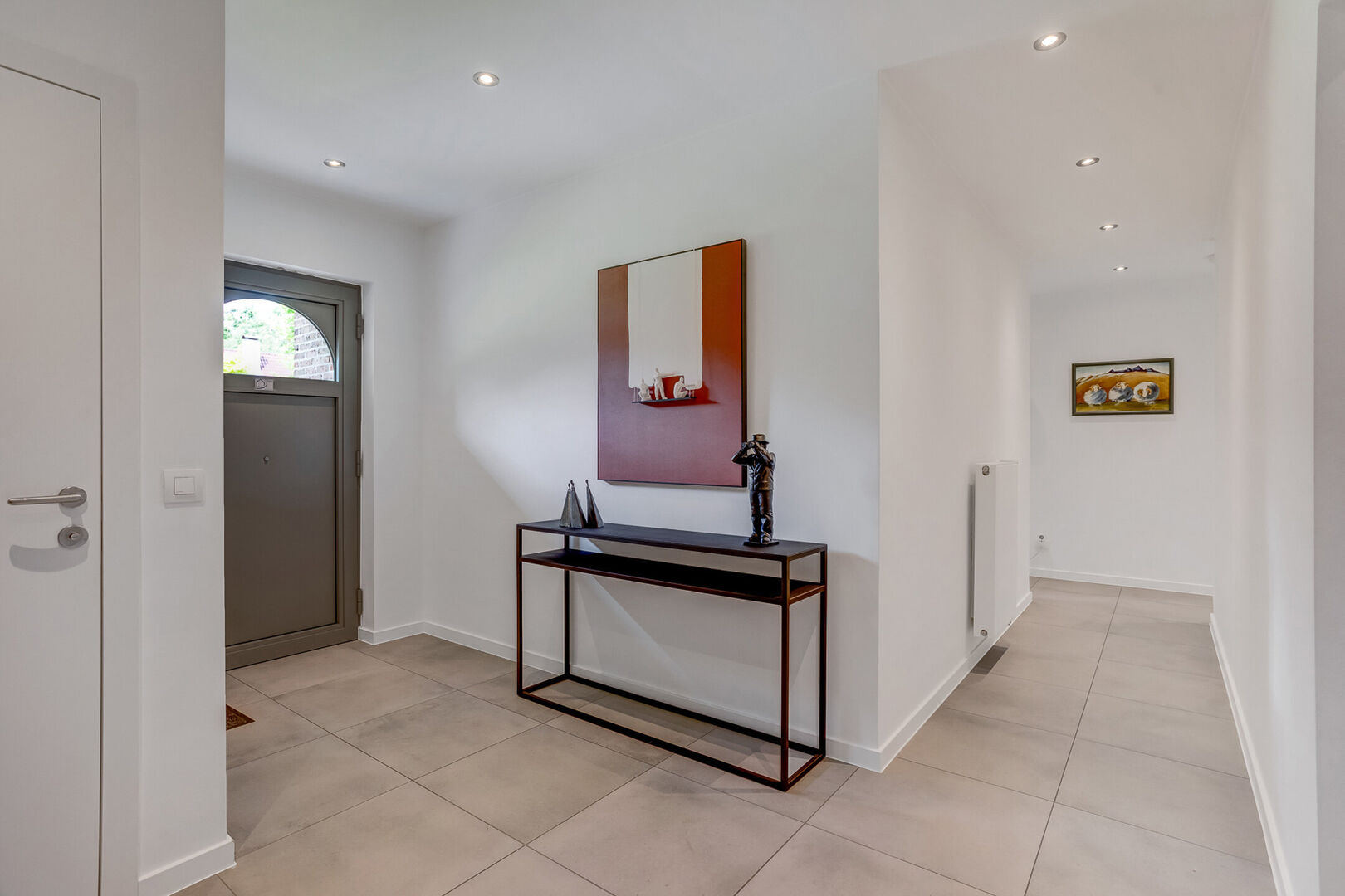 De ruime inkomhal met gastentoilet en vestiaire leidt naar een lichtrijke leefruimte met open haard, eetkamer, maatwerk wandkasten en een subtiel geïntegreerde walk-in berging. De strakke keuken met eiland sluit perfect aan op de leefruimte. Ook de praktische wasplaats en dubbele garage (met automatische poort) werden mee opgenomen in het nieuwe ontwerp.