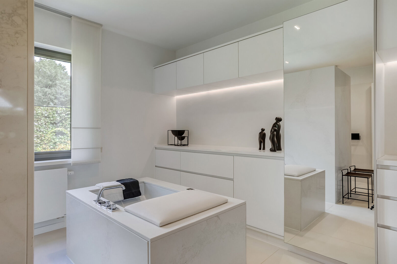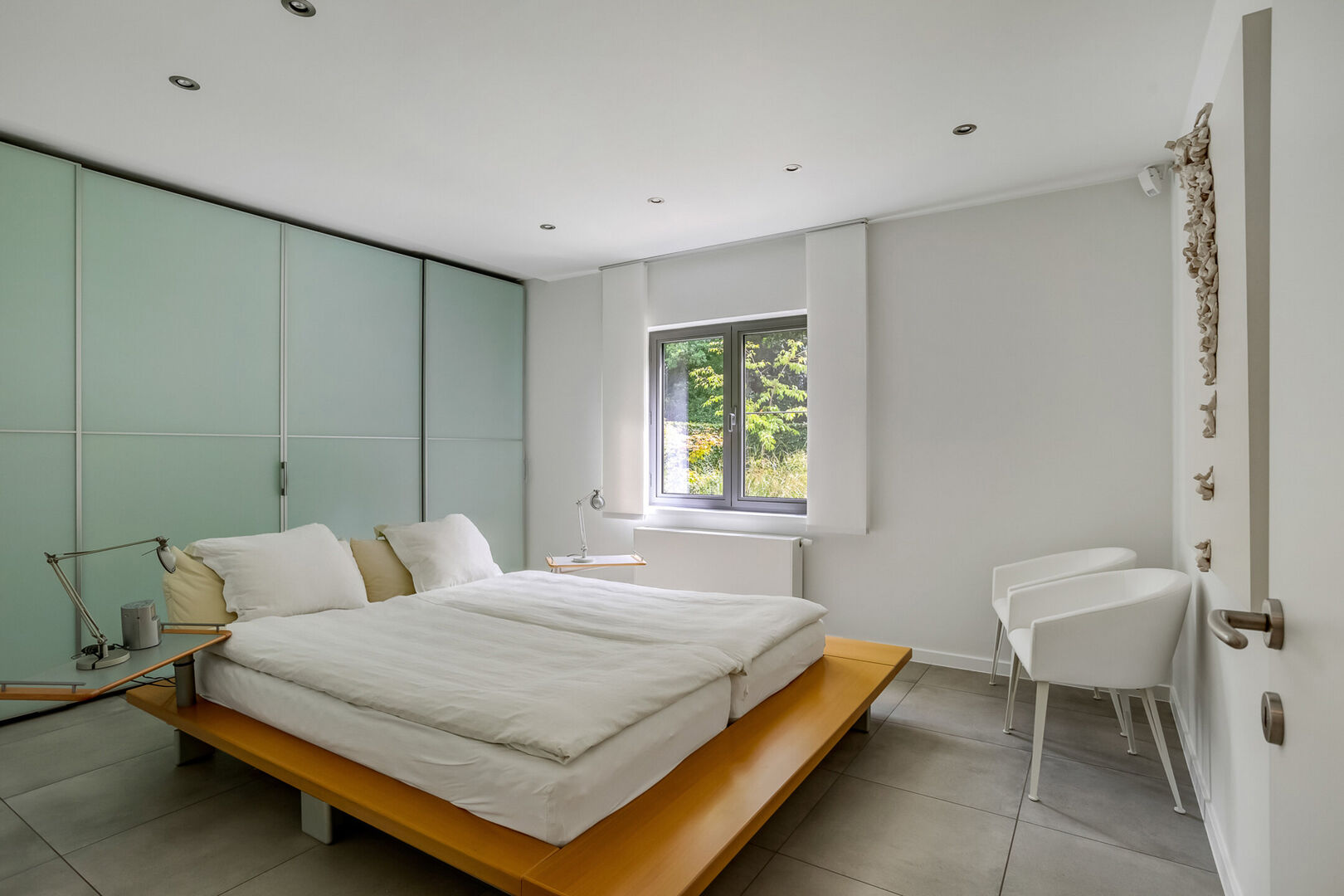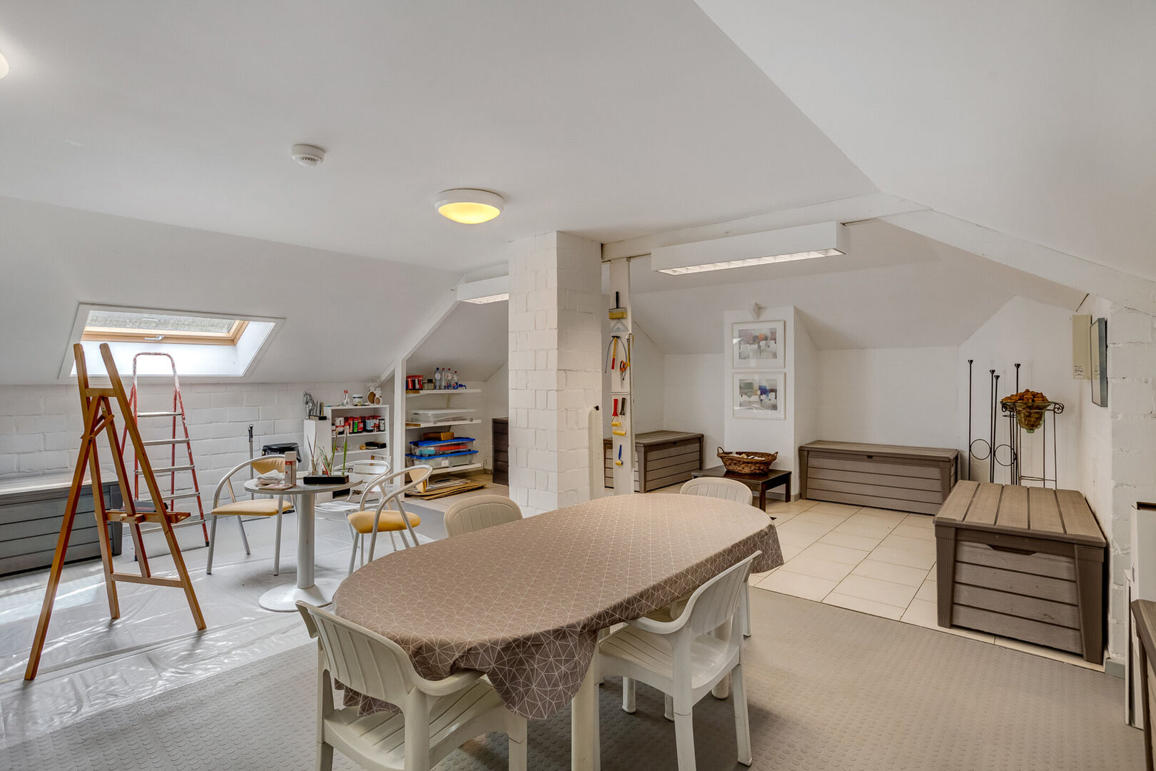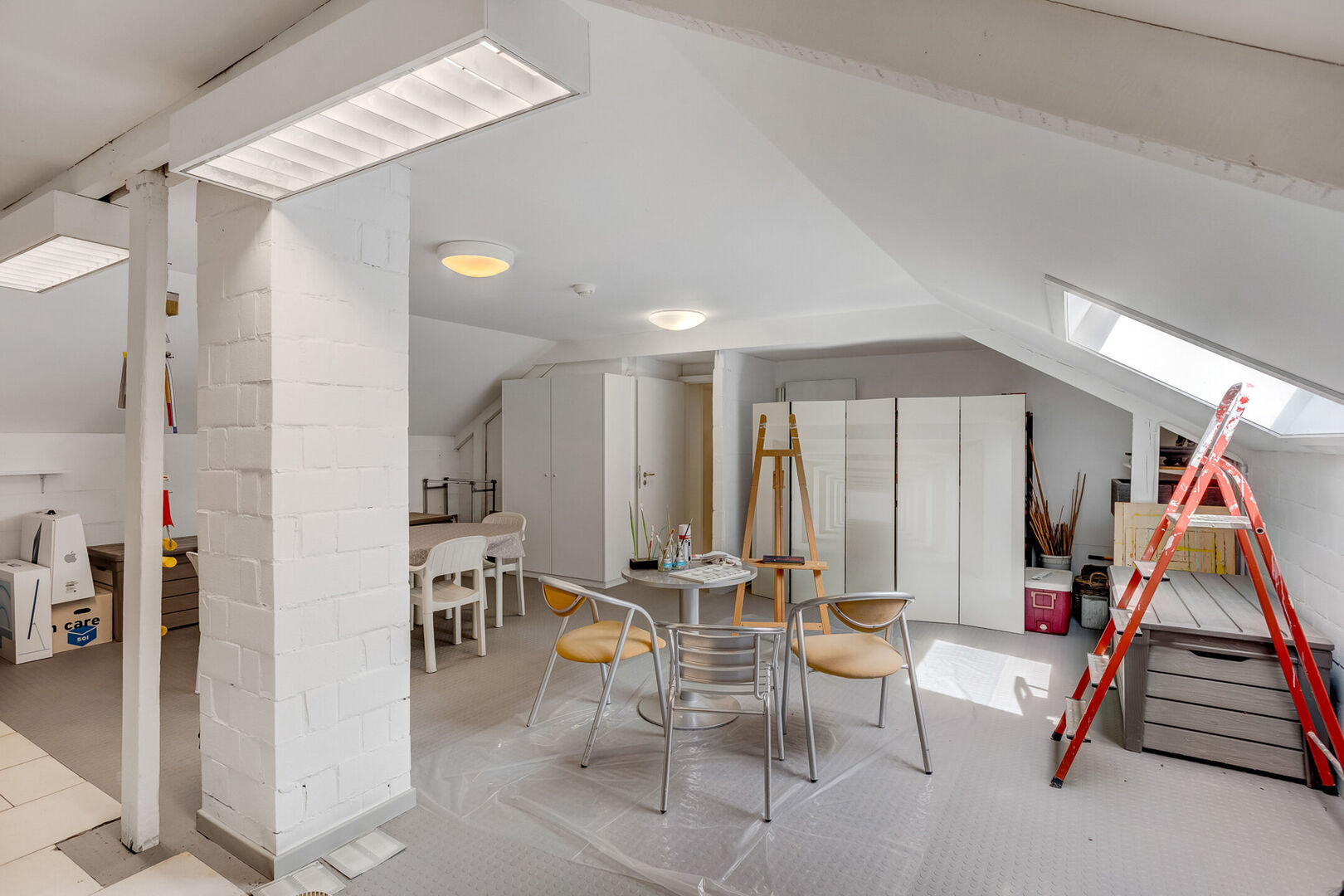 De woning beschikt over vier slaapkamers op het gelijkvloers, waarvan twee momenteel ingericht als bureau. De luxueuze badkamer straalt wellness uit met een inloopdouche, foot bath (Dornbracht) en dubbele lavabo. Op de verdieping vinden we nog een extra slaapkamer (in gebruik als spreekkamer), een zolderkamer als berging, en een royale atelierruimte met het potentieel van een kleine studio.