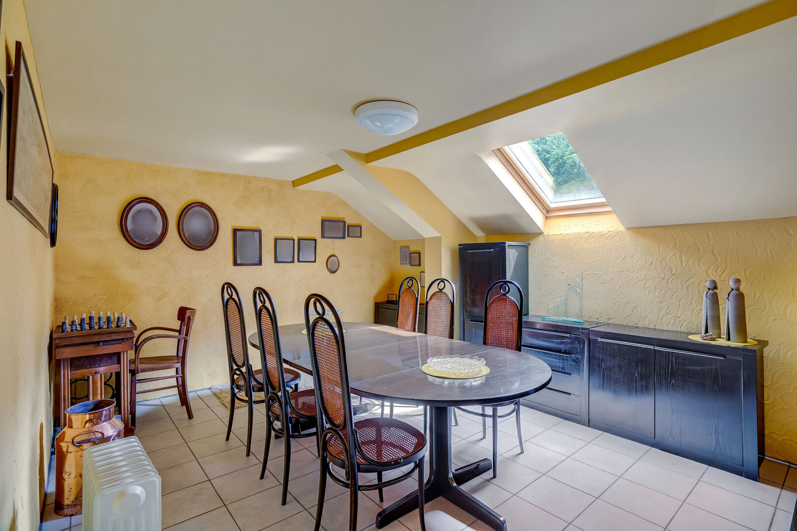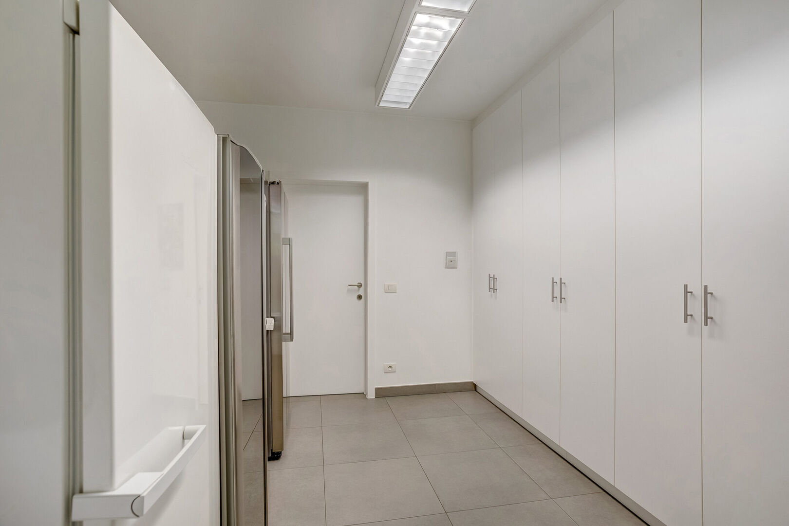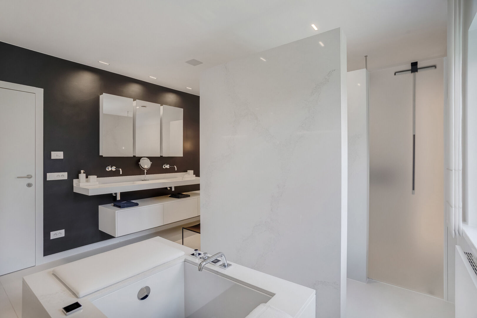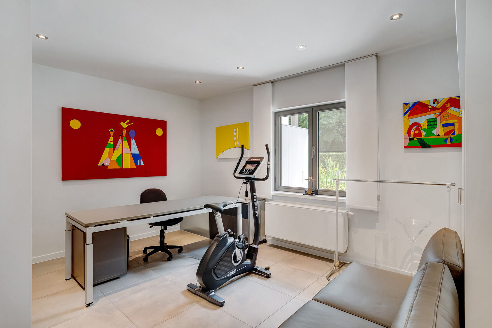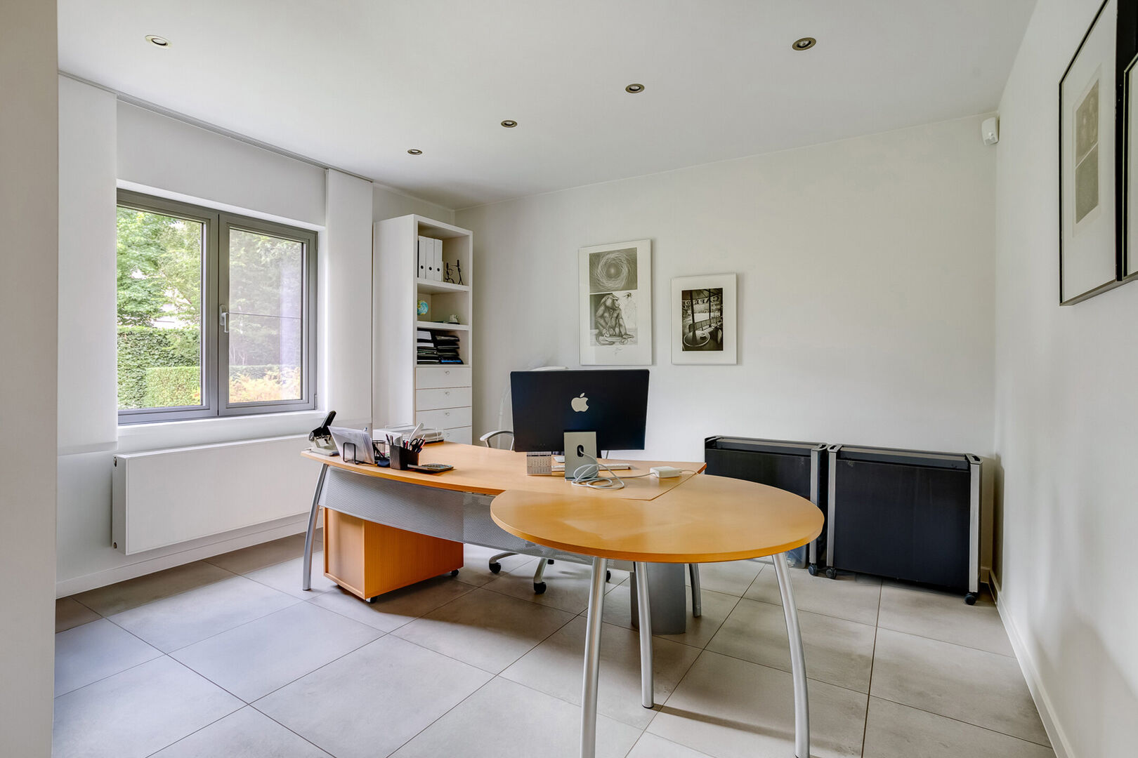 De woning beschikt over vier slaapkamers op het gelijkvloers, waarvan twee momenteel ingericht als bureau. De luxueuze badkamer straalt wellness uit met een inloopdouche, foot bath (Dornbracht) en dubbele lavabo. Op de verdieping vinden we nog een extra slaapkamer (in gebruik als spreekkamer), een zolderkamer als berging, en een royale atelierruimte met het potentieel van een kleine studio.
